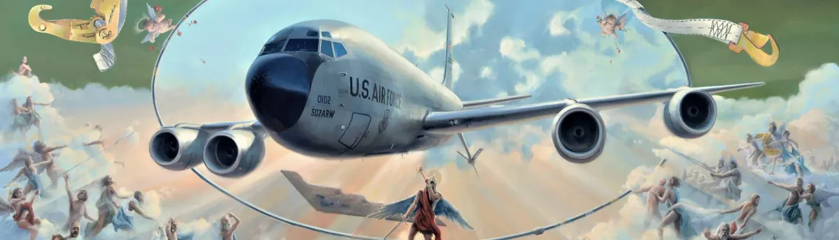 Darby Perrin’s love for aviation began in 1986 when he joined the United States Air Force. Already an accomplished artist, the military fed his creativity and afforded many opportunities to paint and design. He’s been a Crew Chief and flew as an Airborne Communications Technician on AWACS. He was a KC-135 Boom Operator for 20 years. In 2018 he was employed by the Air Force Reserve Command History Office as a full time Historian/Artist. He retired from the Air Force in December of 2021 and still runs his gallery and studio on Tinker AFB outside of Oklahoma City.