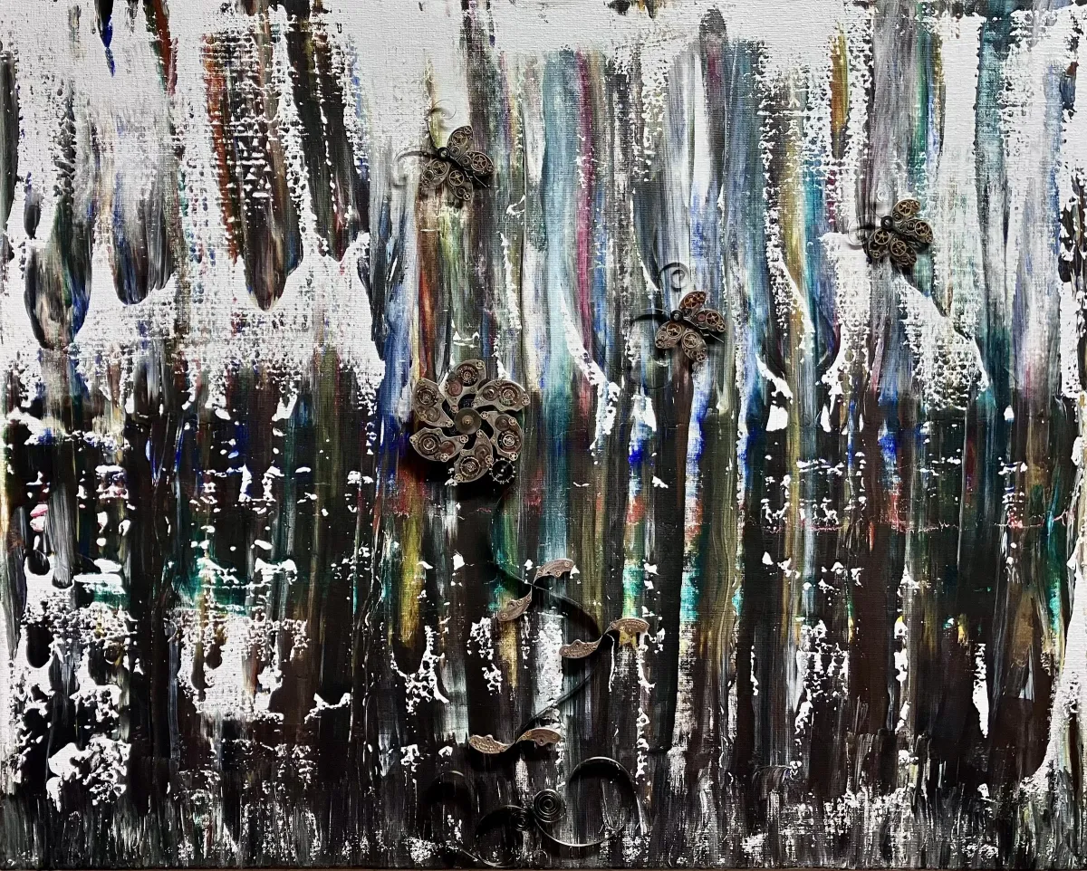 My work is mixed media acrylic paint embellished with time components and mechanisms and sealed with epoxy resin.
