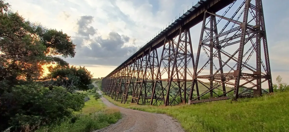 railway trestlebridgelandscapesunsetdirt pathgreen fieldsinfrastructureRealismLight / SereneStorytelling / NarrativeLandscape / NatureCity / Architecture