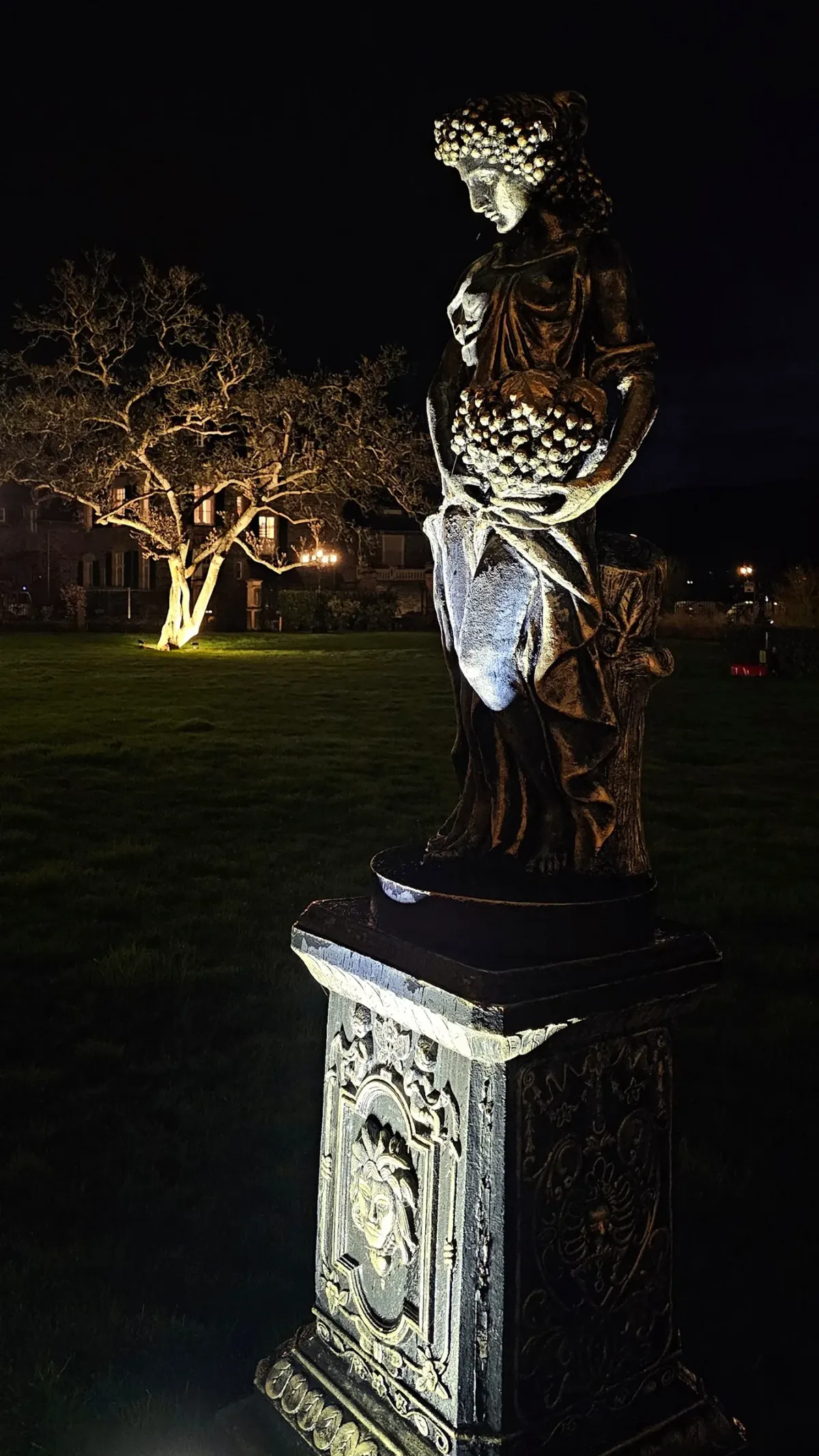 Classical StatueNight PhotographyGarden ArtIlluminationGrapesBare TreeOrnate PedestalRealismDark / DramaticStorytelling / NarrativeContemporary / ModernHistorical / CulturalLandscape / NatureSpiritual / Symbolic