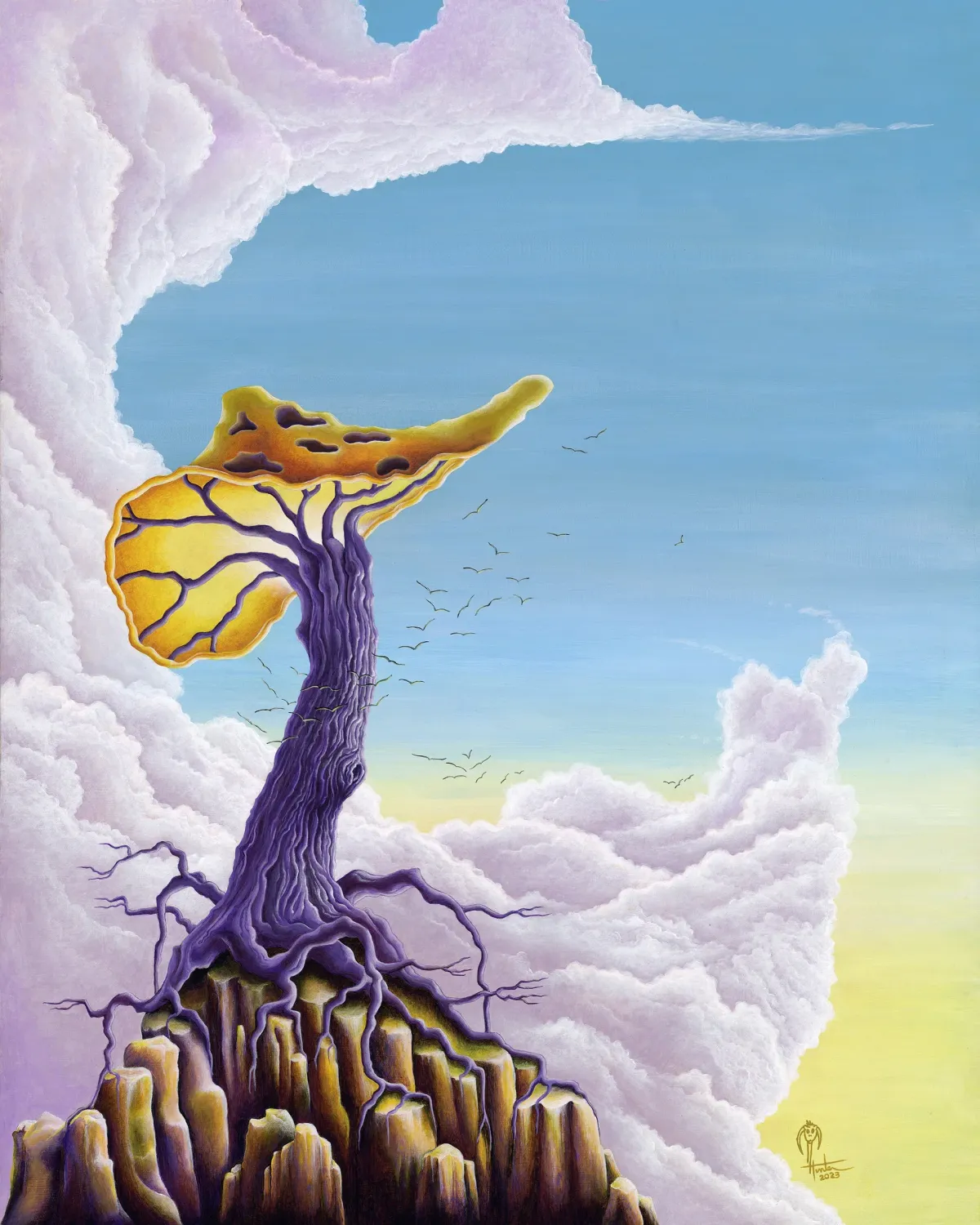 surreal landscapefantasy treepurple trunkgolden foliageethereal cloudscliffsideflying birdsRealismContemporary / ModernBold / GraphicStorytelling / NarrativeLandscape / NatureSurreal / ImaginativeSpiritual / Symbolic