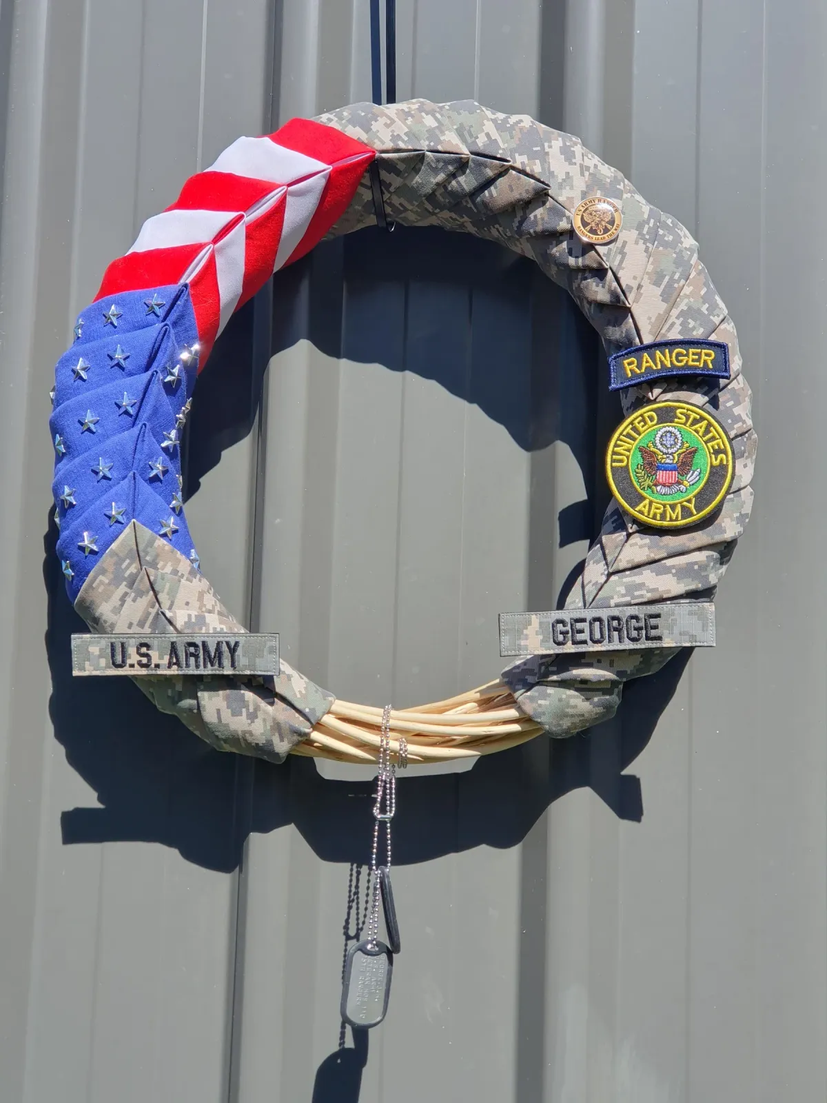 Military wreathU.S. ArmyPatriotismCommemorationCamouflageDog tagsVeteranRealismStorytelling / NarrativeInspirational / UpliftingTherapeutic / ReflectivePatriotic / Military / FreedomVeteran Story / ServiceSpiritual / SymbolicHistorical / CulturalConflict / Sacrifice