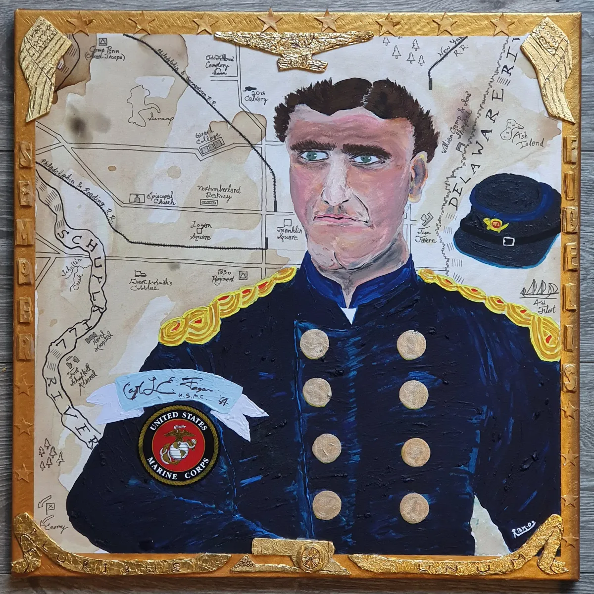 military portraitUS Marine Corpshistorical mapmixed mediauniformgold accentspatriotismRealismStorytelling / NarrativeBold / GraphicInspirational / UpliftingPatriotic / Military / FreedomVeteran Story / ServicePortrait / PeopleHistorical / CulturalConflict / Sacrifice