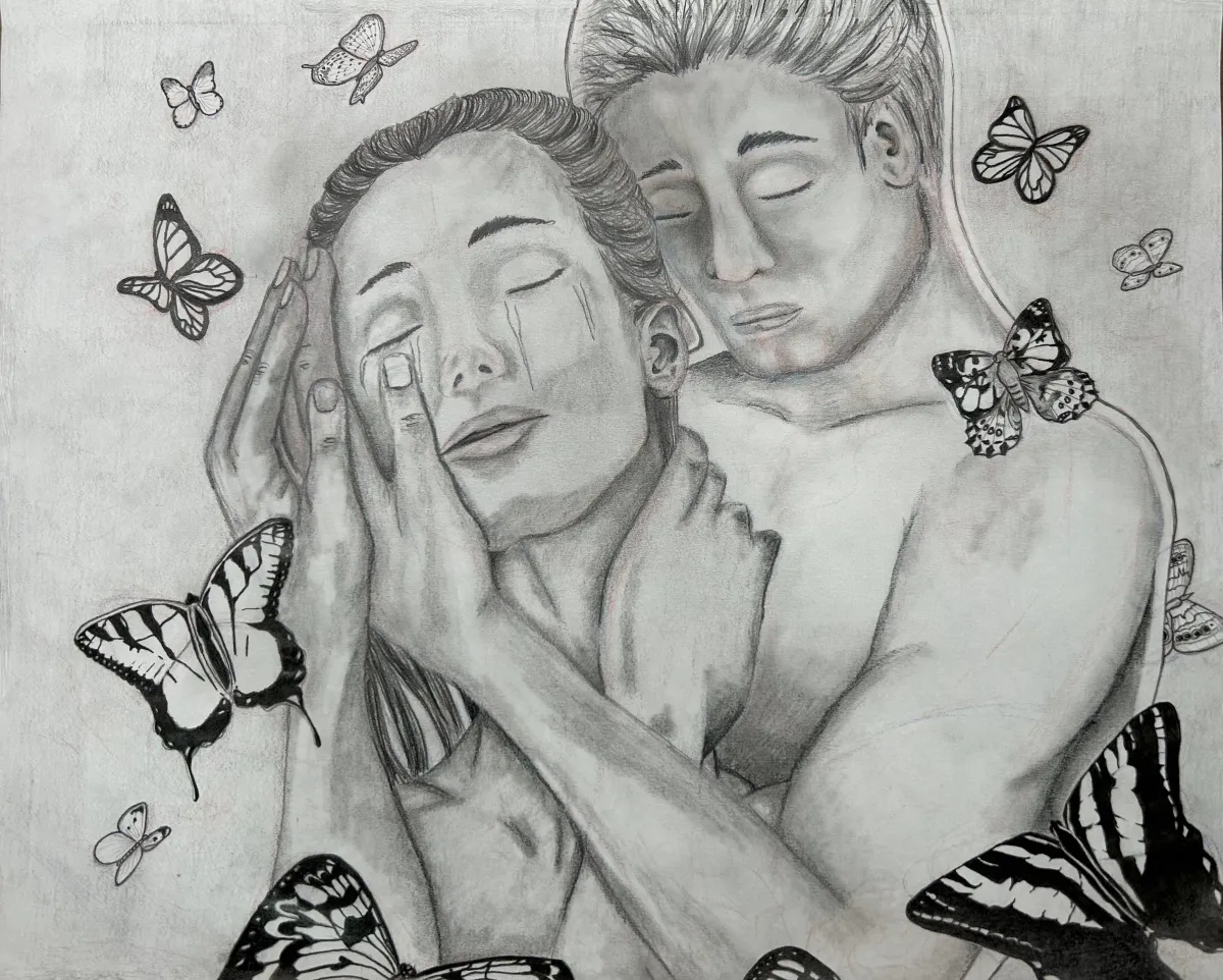 charcoal drawingcoupleembracecryingbutterfliesemotionalmonochromeRealismExpressionism / EmotionalDark / DramaticStorytelling / NarrativeTherapeutic / ReflectivePortrait / PeopleSpiritual / SymbolicConflict / SacrificeHope / Healing / Resilience