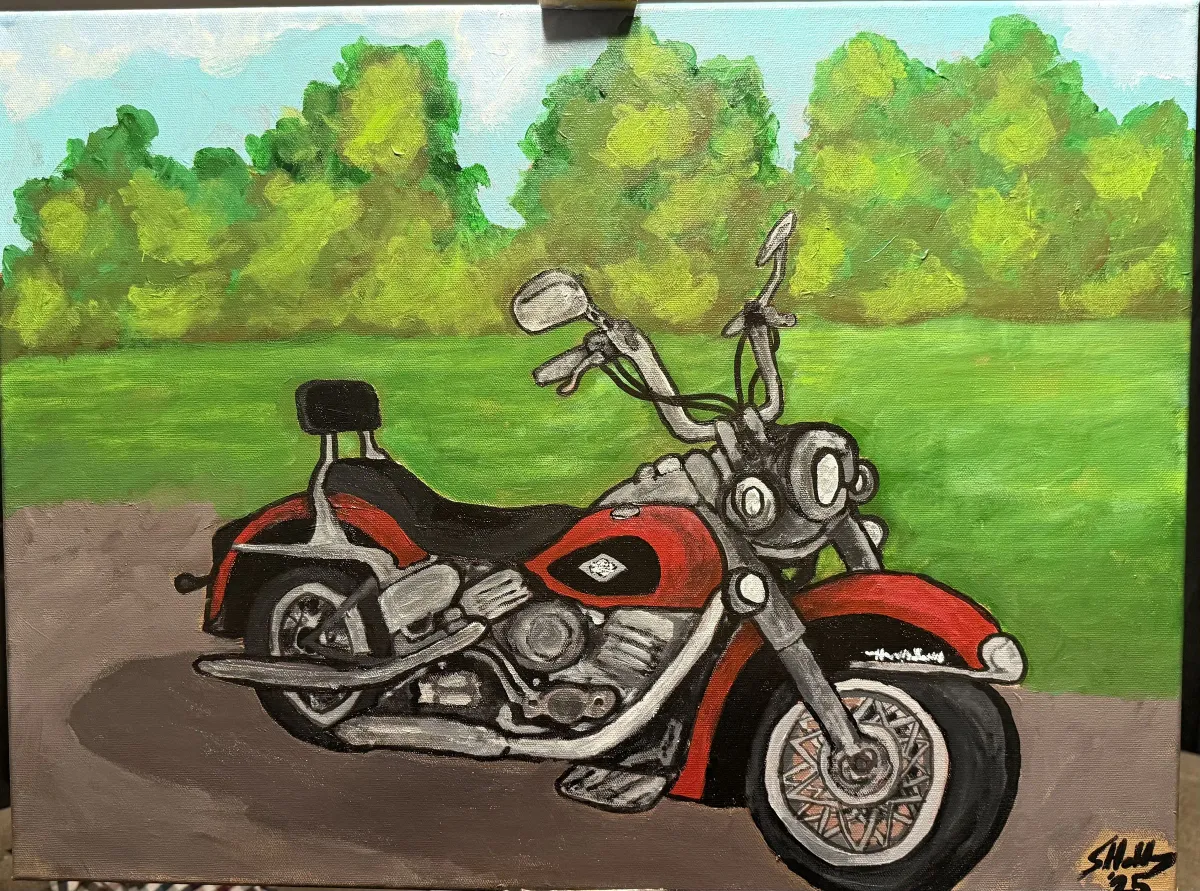 motorcyclepaintingredgreen treesroadskyvehicleRealismBold / GraphicStill Life / ObjectsLandscape / Nature