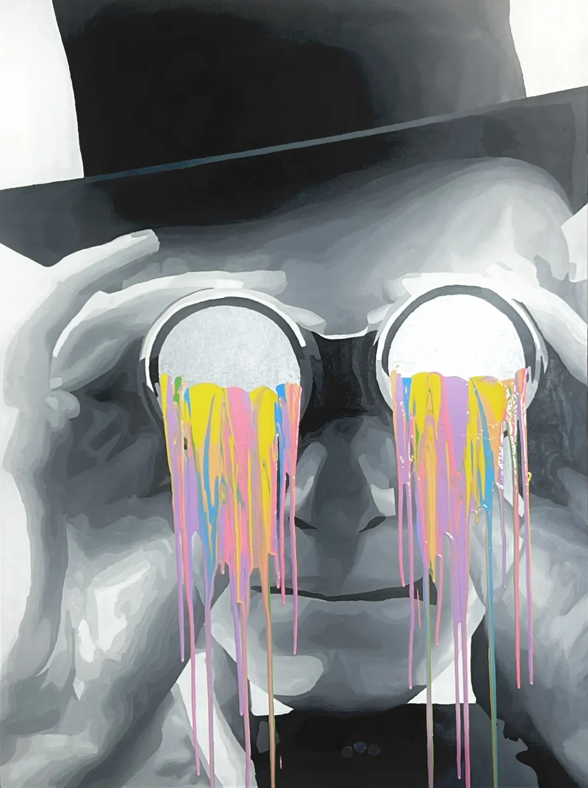 grayscalebinocularsdripping painttop hatvibrant colorspop artsurrealContemporary / ModernExpressionism / EmotionalBold / GraphicStorytelling / NarrativePortrait / PeopleAbstract / ConceptualSurreal / Imaginative