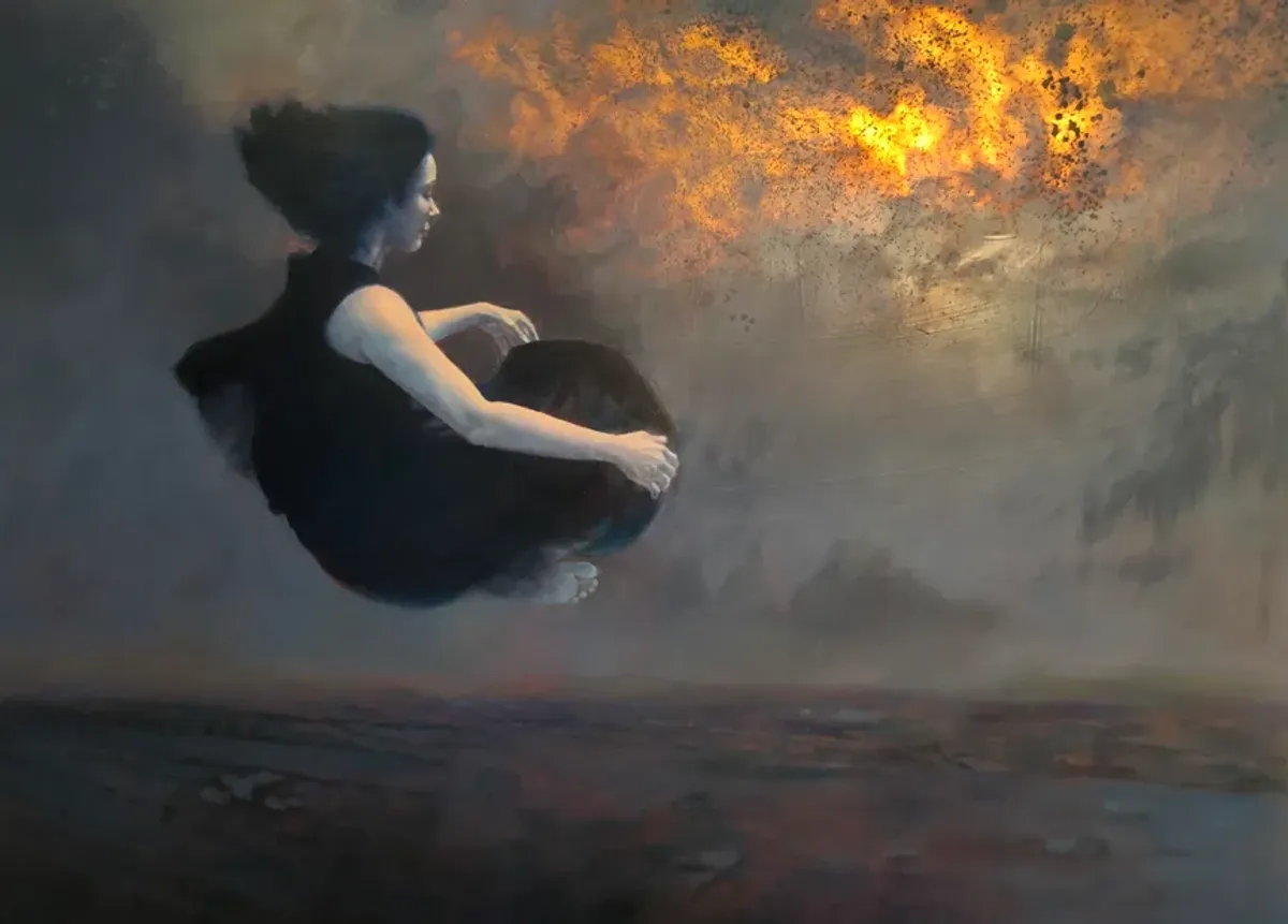 floating womansurrealstormy skygolden lightdark artcontemplationmysticalRealismExpressionism / EmotionalContemporary / ModernDark / DramaticStorytelling / NarrativePortrait / PeopleSpiritual / SymbolicSurreal / Imaginative