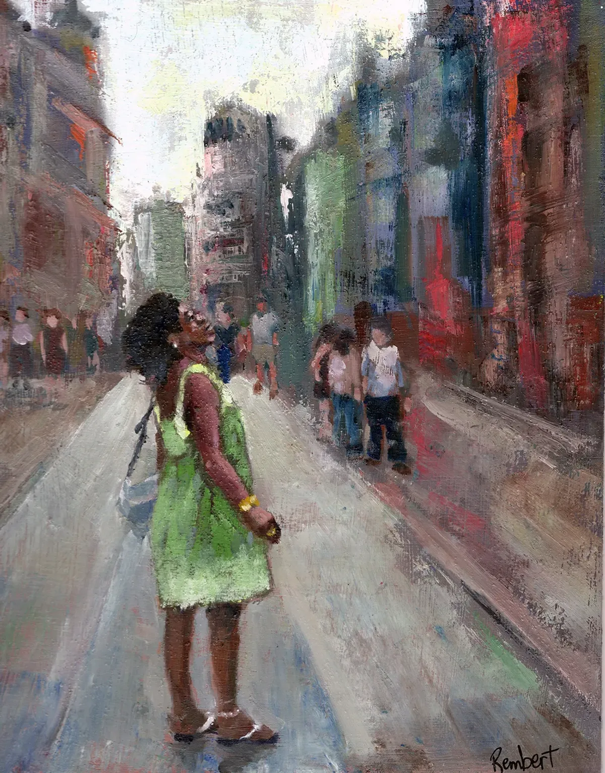 cityscapeurban streetwomangreen dressimpressionisticpaintingstreet sceneImpressionismExpressionism / EmotionalStorytelling / NarrativeContemporary / ModernCity / ArchitecturePortrait / PeopleHistorical / Cultural