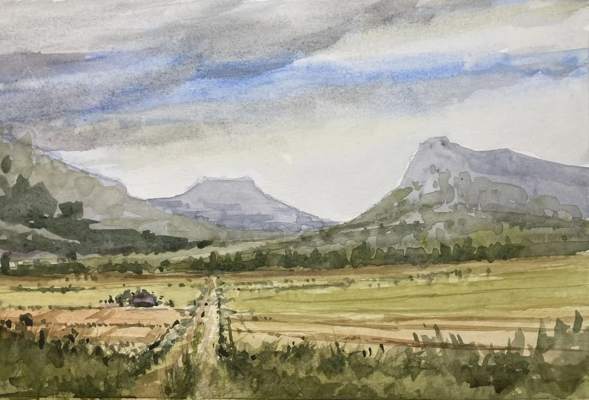 WatercolorLandscapeMountainsValleyFieldsCloudy skyNatureRealismImpressionismLight / SereneLandscape / Nature