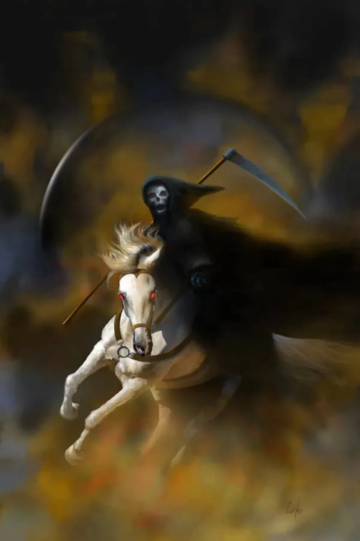 Grim ReaperDeathHorseScytheFantasyDark ArtApocalypseDark / DramaticStorytelling / NarrativeBold / GraphicExpressionism / EmotionalSpiritual / SymbolicSurreal / ImaginativeConflict / Sacrifice