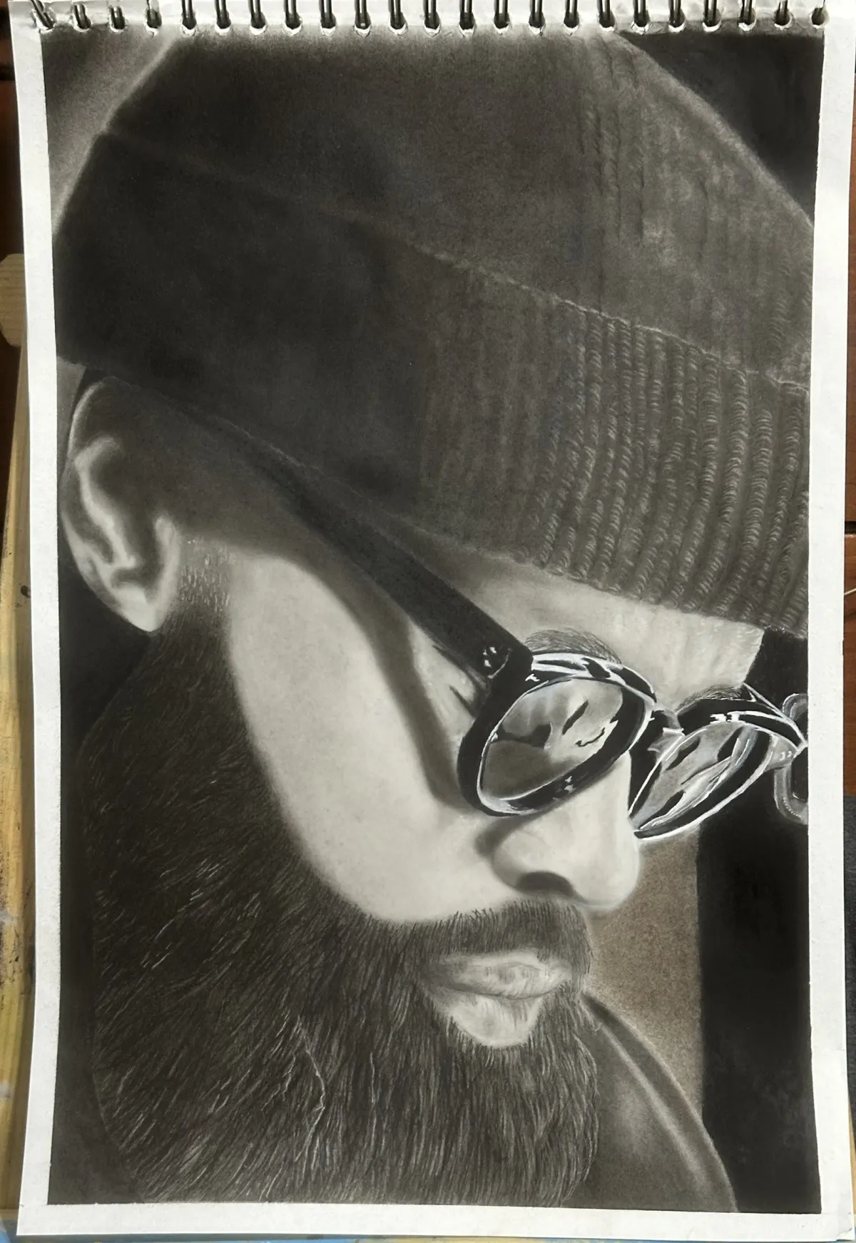 charcoal drawingportraitmanbeardglassesbeaniemonochromaticRealismDark / DramaticStorytelling / NarrativePortrait / People