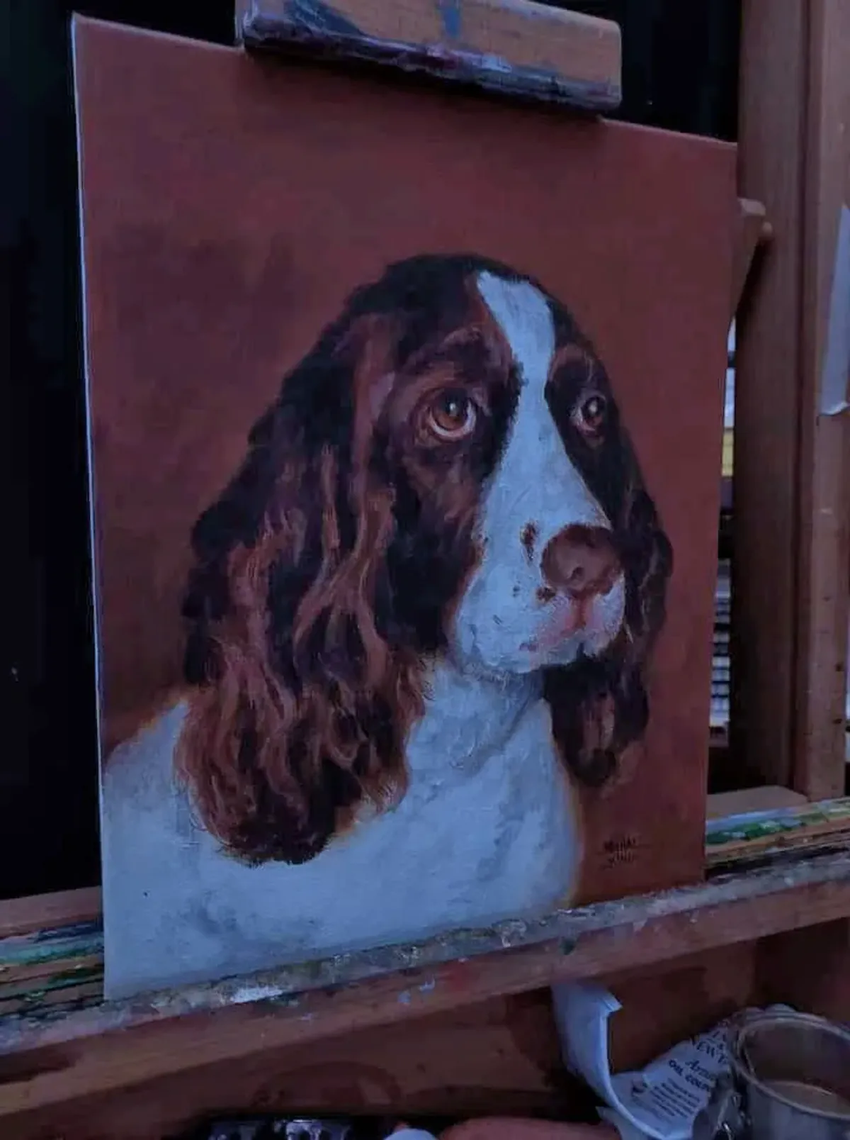 dog portraitoil paintingspanielanimal arteaselbrown and whitepet artRealismStorytelling / NarrativeAnimals / Wildlife