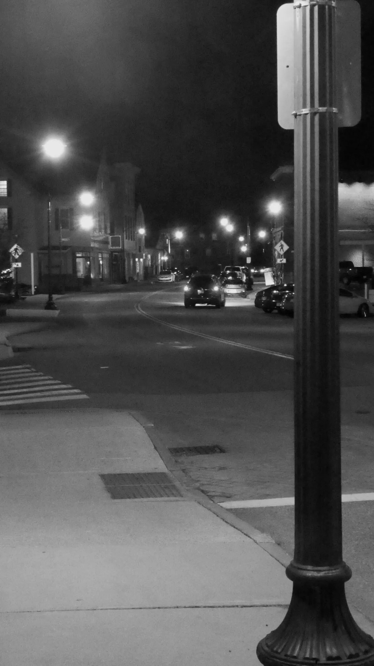 night streetblack and whitecityscapestreetlightsurban nightlamppostvehiclesRealismDark / DramaticStorytelling / NarrativeCity / Architecture
