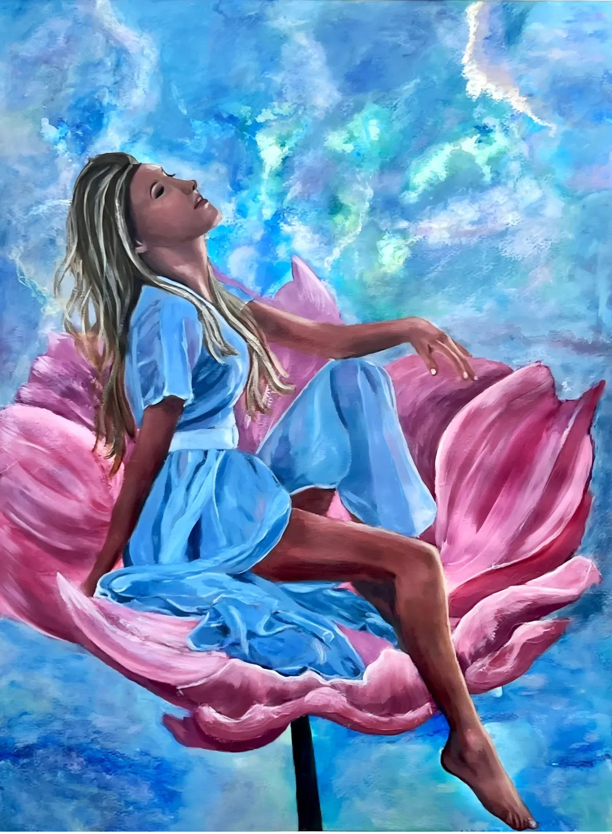 WomanFlowerSkySerenePinkBlueDreamyRealismExpressionism / EmotionalLight / SereneStorytelling / NarrativeInspirational / UpliftingPortrait / PeopleSpiritual / SymbolicSurreal / ImaginativeHope / Healing / Resilience