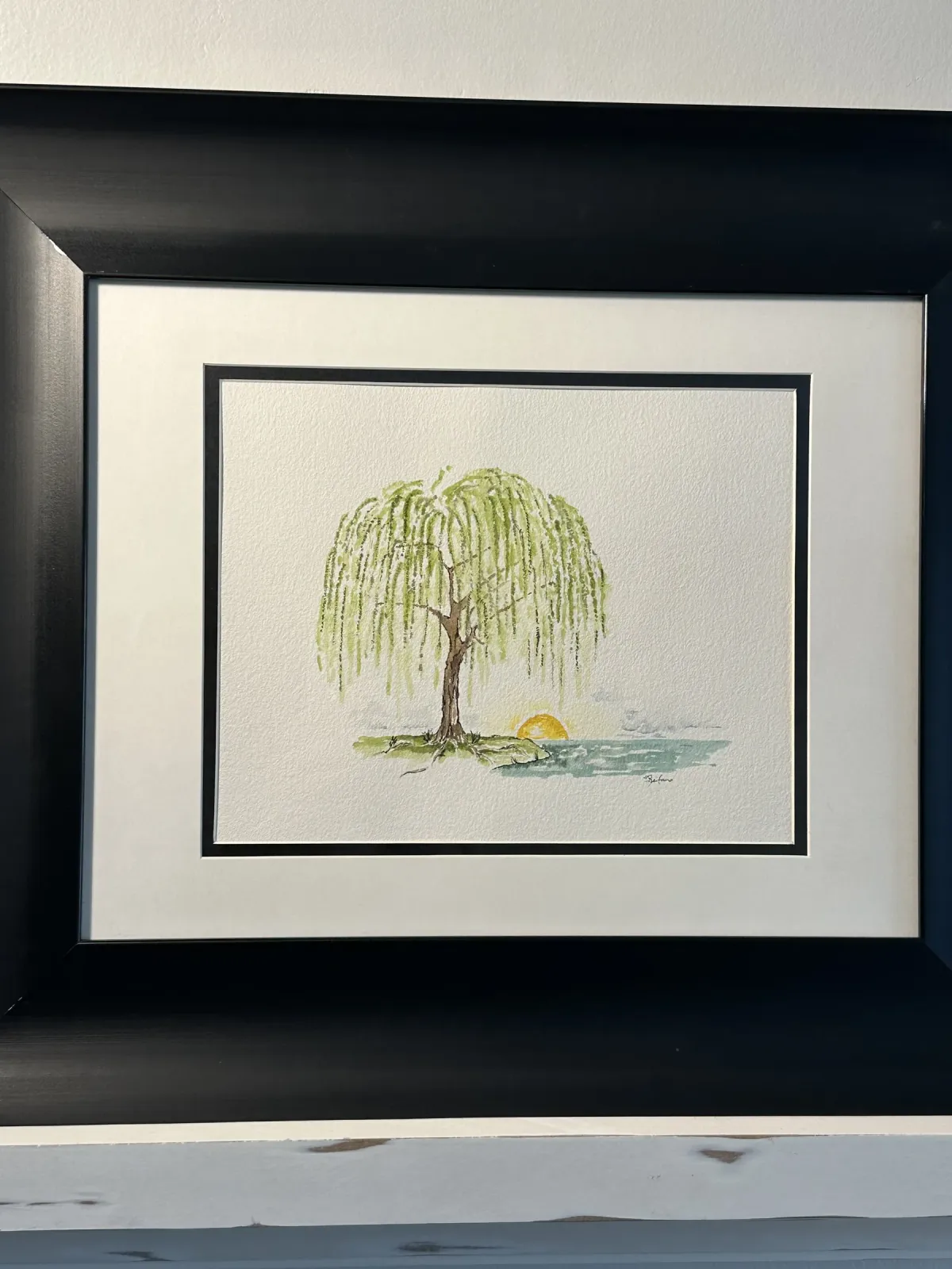 weeping willowwatercolorsunsetlandscapetreesereneframed artRealismLight / SereneTherapeutic / ReflectiveInspirational / UpliftingLandscape / NatureSeascape / WaterSpiritual / SymbolicHope / Healing / Resilience