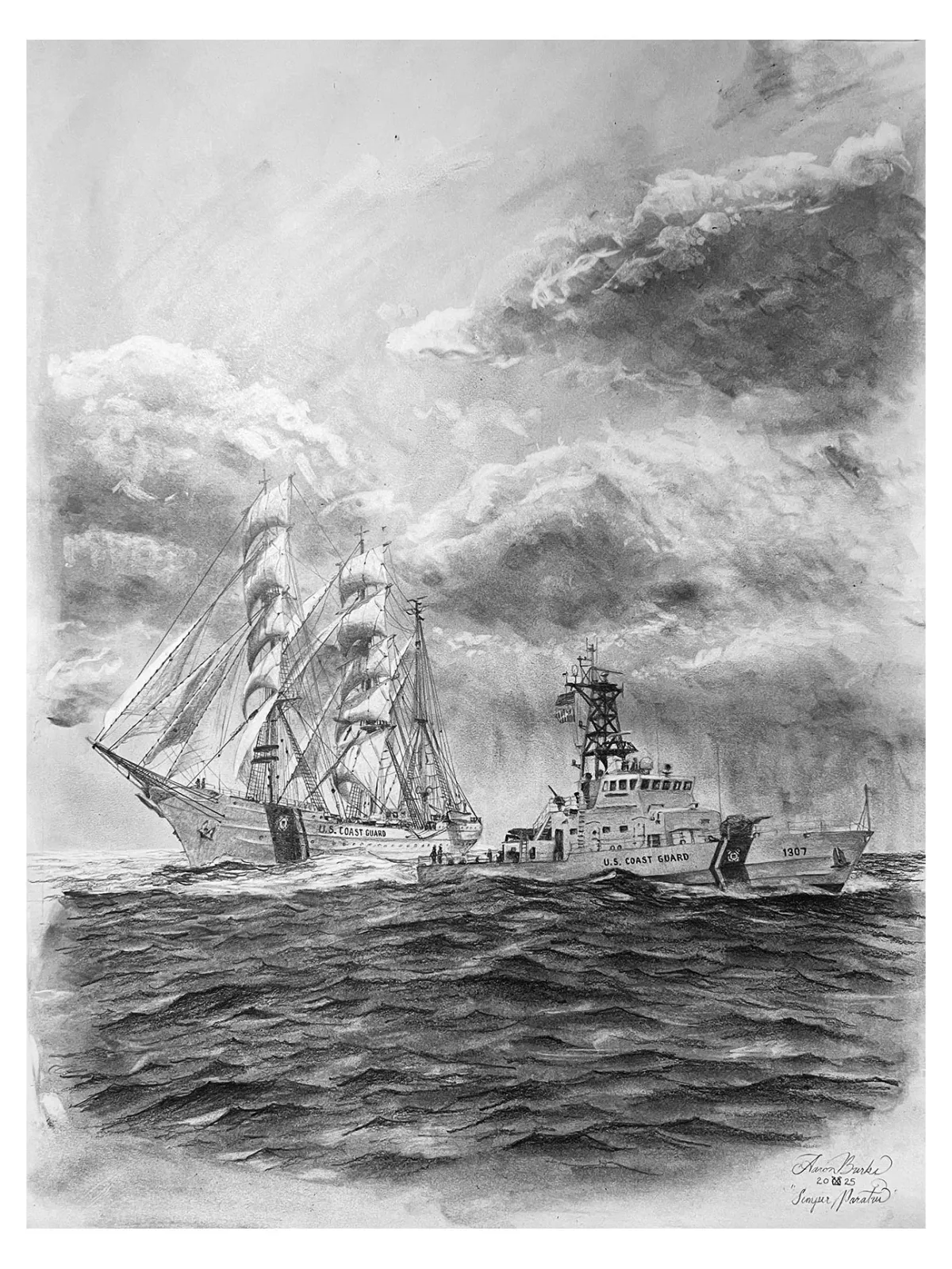 U.S. Coast Guardtall shipmodern cutterseascapepencil drawingmonochromemaritimeRealismDark / DramaticStorytelling / NarrativePatriotic / Military / FreedomSeascape / WaterHistorical / Cultural