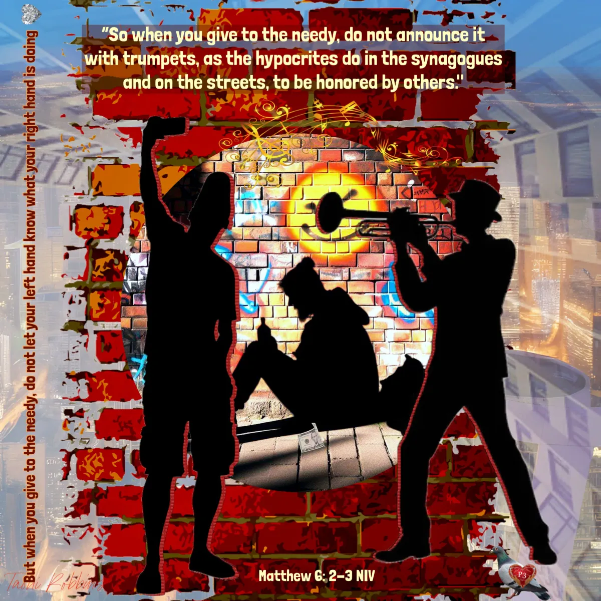 silhouettesgraffitistreet arttrumpet playermusical notesbiblical quotecityscapeContemporary / ModernBold / GraphicStorytelling / NarrativeCity / ArchitecturePortrait / PeopleSpiritual / SymbolicStatement / Activism