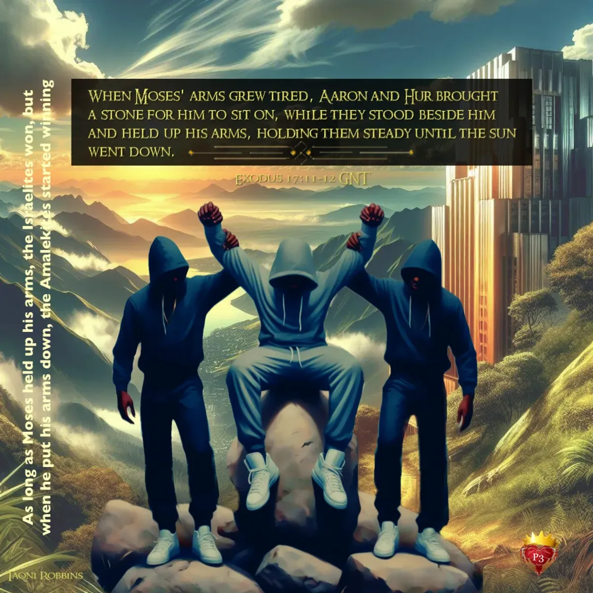 hooded figuresbiblical referenceExodussupportmountainscityscapesunrise/sunsetRealismStorytelling / NarrativeInspirational / UpliftingBold / GraphicSpiritual / SymbolicHistorical / CulturalHope / Healing / Resilience