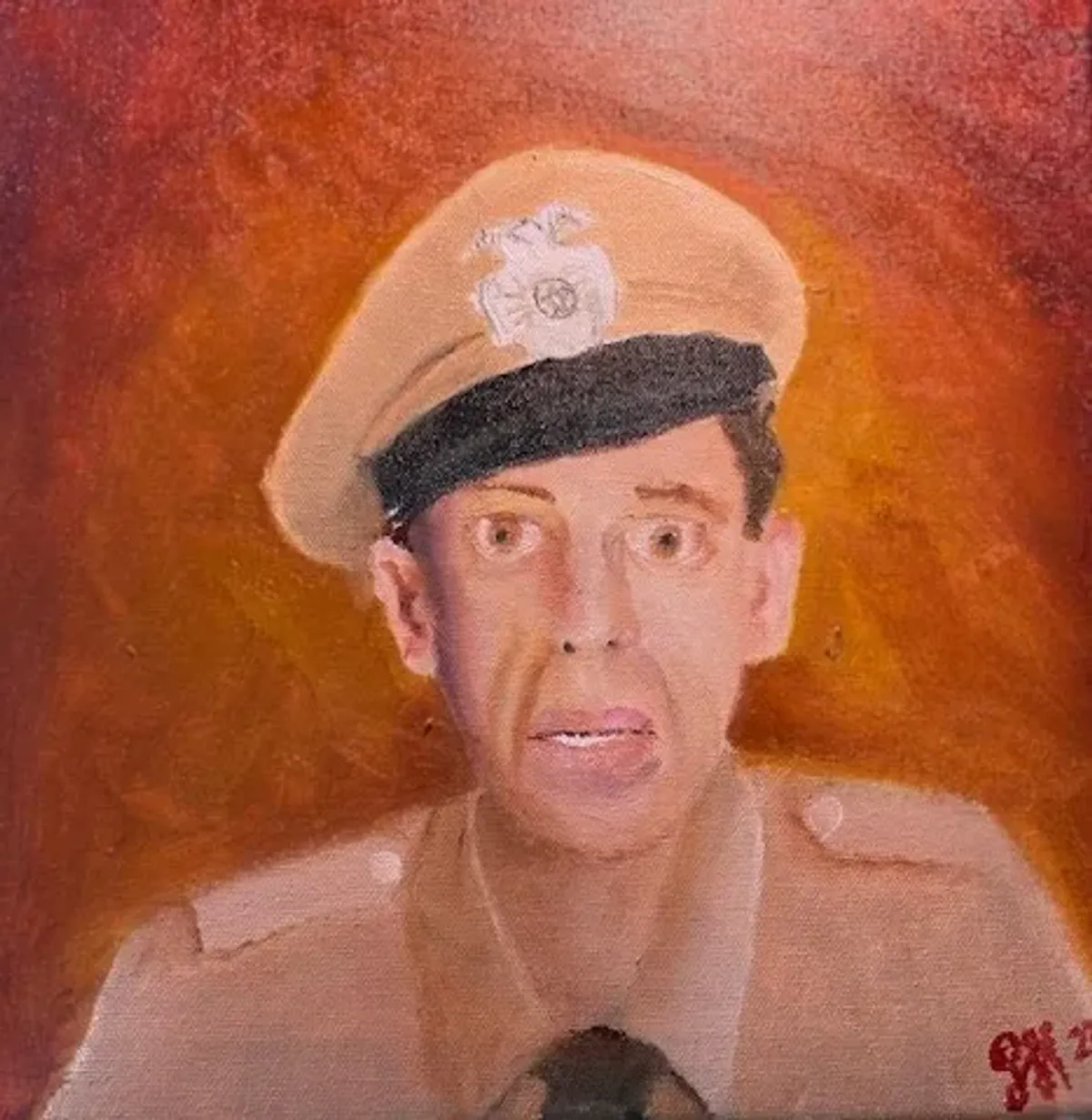 PortraitMilitary uniformBeretExpressionismDramaticOil paintingFiery backgroundRealismExpressionism / EmotionalDark / DramaticStorytelling / NarrativePatriotic / Military / FreedomPortrait / PeopleConflict / Sacrifice