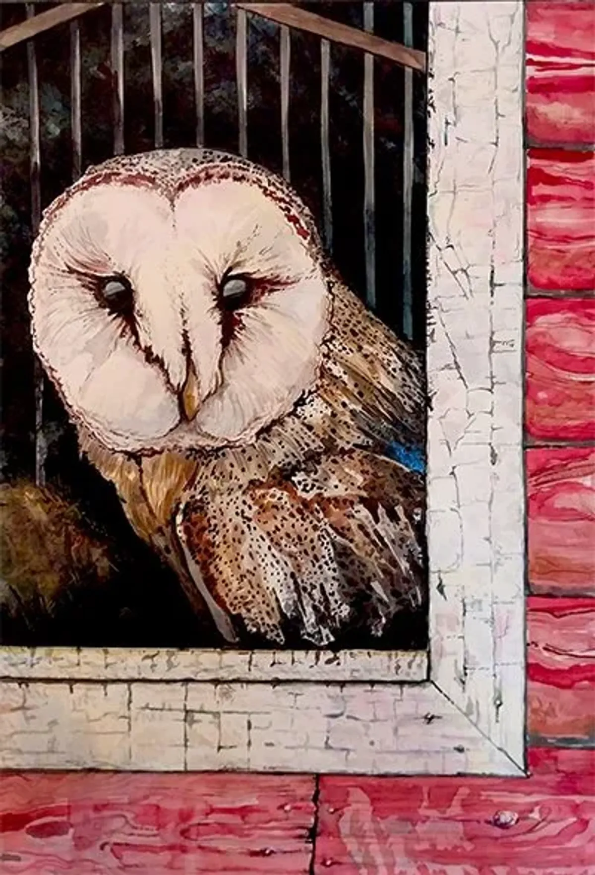 Barn owlcagedbirdwindowred wallconfinementanimal artRealismExpressionism / EmotionalStorytelling / NarrativeBold / GraphicAnimals / WildlifeConflict / SacrificeSpiritual / Symbolic