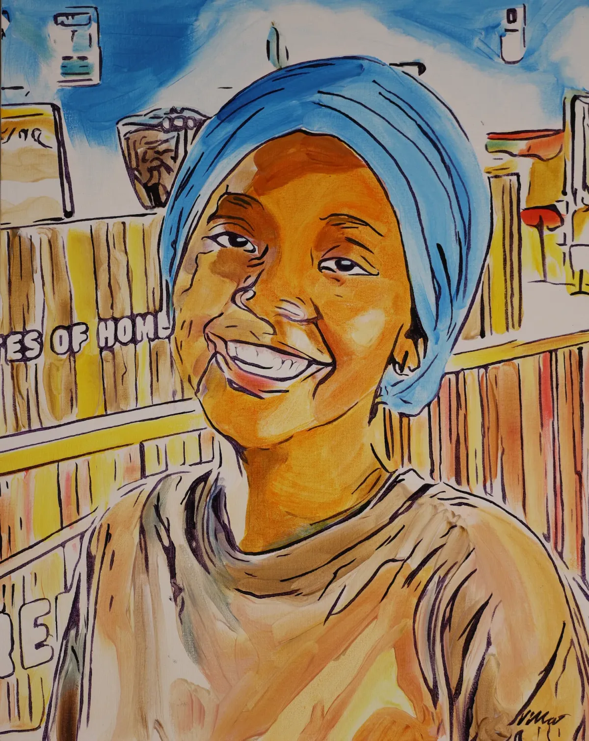 portraitsmilingpersonhead coveringbookshelvescolorfulexpressiveExpressionism / EmotionalBold / GraphicContemporary / ModernInspirational / UpliftingPortrait / PeopleHope / Healing / Resilience
