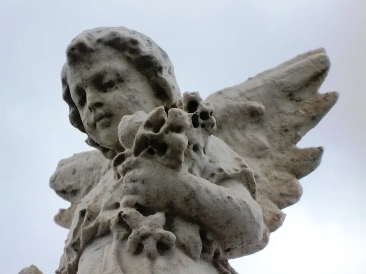 stone statueangelcherubweatheredsculpturereligious artgrayRealismDark / DramaticStorytelling / NarrativeSpiritual / SymbolicHistorical / CulturalPortrait / People