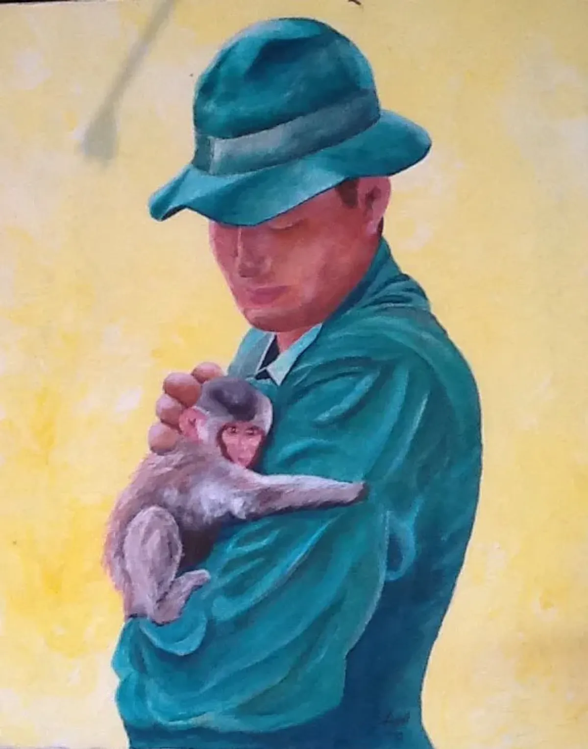 paintingmanmonkeyanimal careportraitgreen hatyellow backgroundRealismStorytelling / NarrativeLight / SerenePortrait / PeopleAnimals / WildlifeHope / Healing / Resilience