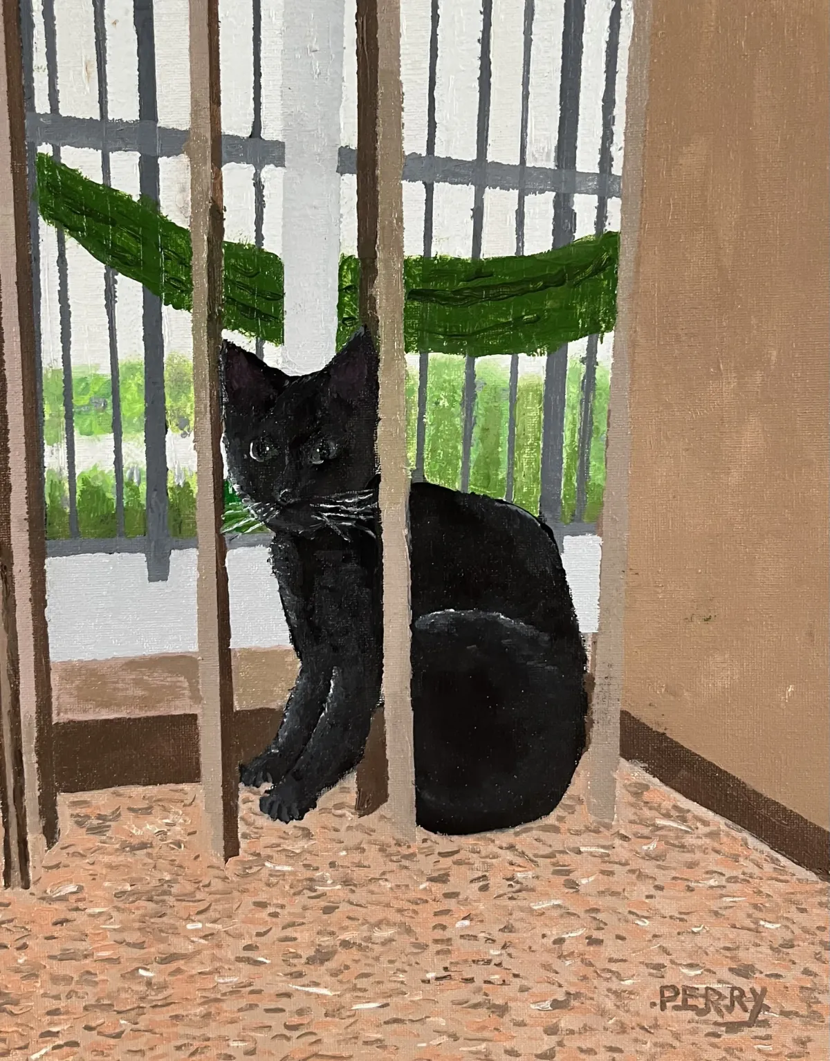black catfelinebarswindowacrylic paintingtexturedanimal portraitRealismExpressionism / EmotionalStorytelling / NarrativeAnimals / WildlifeSpiritual / SymbolicConflict / Sacrifice