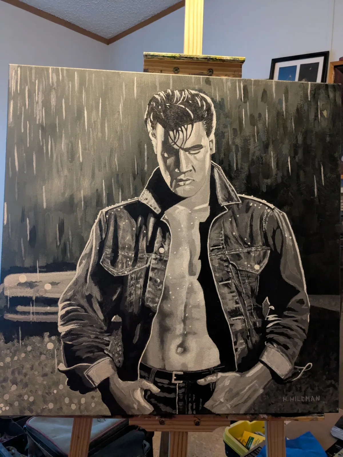 Elvis Presleyportraitgrayscaledenim jacketrainiconicdramaticRealismContemporary / ModernDark / DramaticStorytelling / NarrativePortrait / PeopleHistorical / Cultural