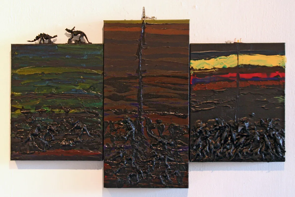 triptychgeological layersoil extractiondinosaursoil rigmixed mediaenvironmental artExpressionism / EmotionalStorytelling / NarrativeContemporary / ModernDark / DramaticHistorical / CulturalConflict / SacrificeSpiritual / Symbolic