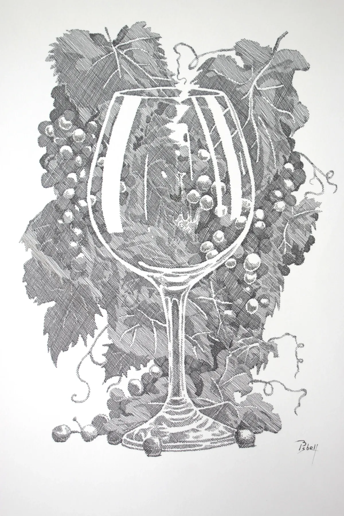 Pen and inkWine glassGrapesVine leavesCross-hatchingMonochromeStill lifeRealismBold / GraphicDark / DramaticStill Life / Objects