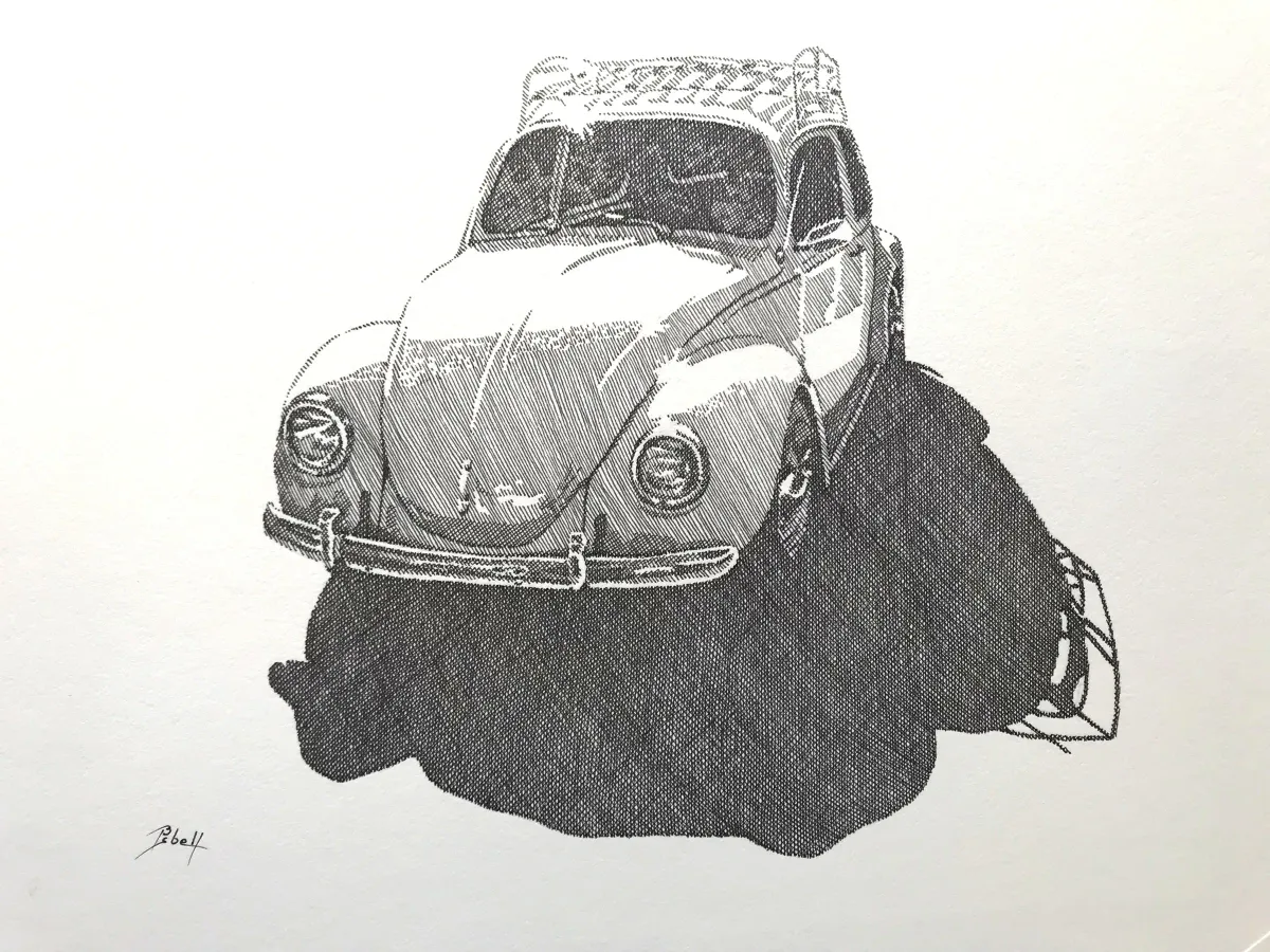 Volkswagen Beetleclassic carcross-hatchingpen and inkmonochromeautomotive artroof rackRealismContemporary / ModernBold / GraphicDark / DramaticStill Life / Objects
