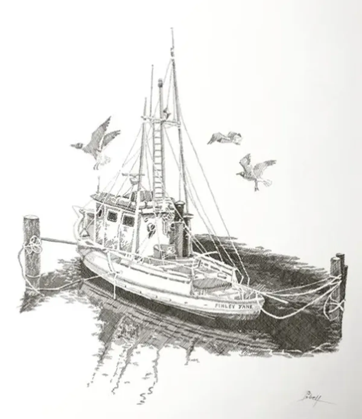 fishing boatpen and inkseascapemonochromeseagullsdockedwater reflectionRealismStorytelling / NarrativeDark / DramaticBold / GraphicSeascape / WaterAnimals / WildlifeStill Life / Objects