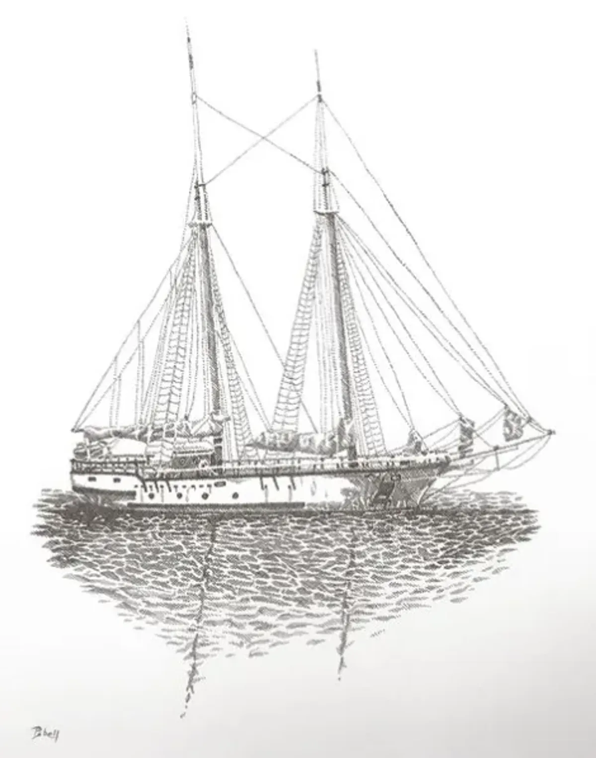 Sailing shipNauticalIllustrationMaritimeRiggingBlack and whiteWater reflectionRealismStorytelling / NarrativeBold / GraphicSeascape / WaterHistorical / Cultural