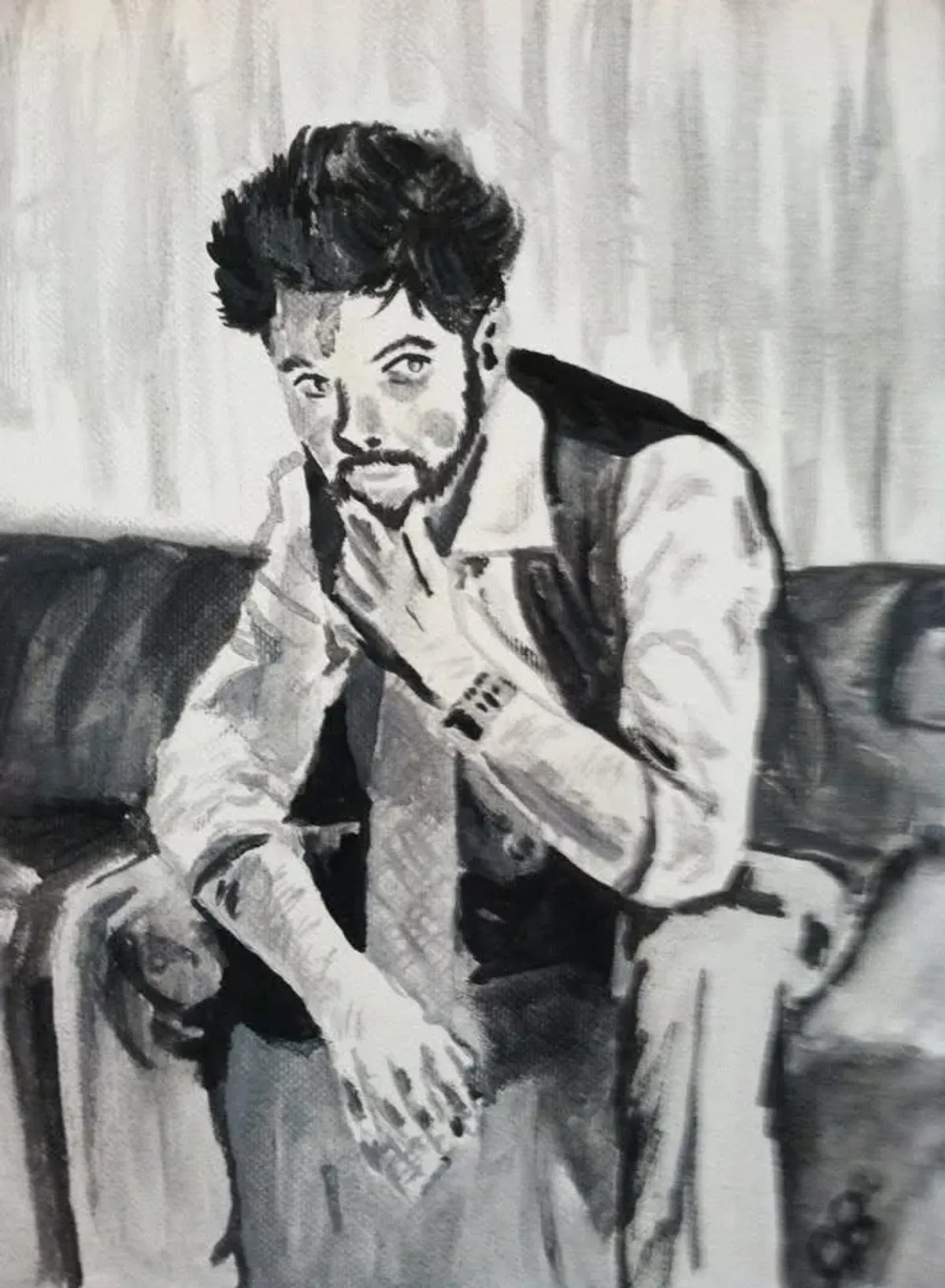 grayscaleportraitmanbeardedpaintingcontemplativemonochromaticRealismContemporary / ModernDark / DramaticStorytelling / NarrativePortrait / People