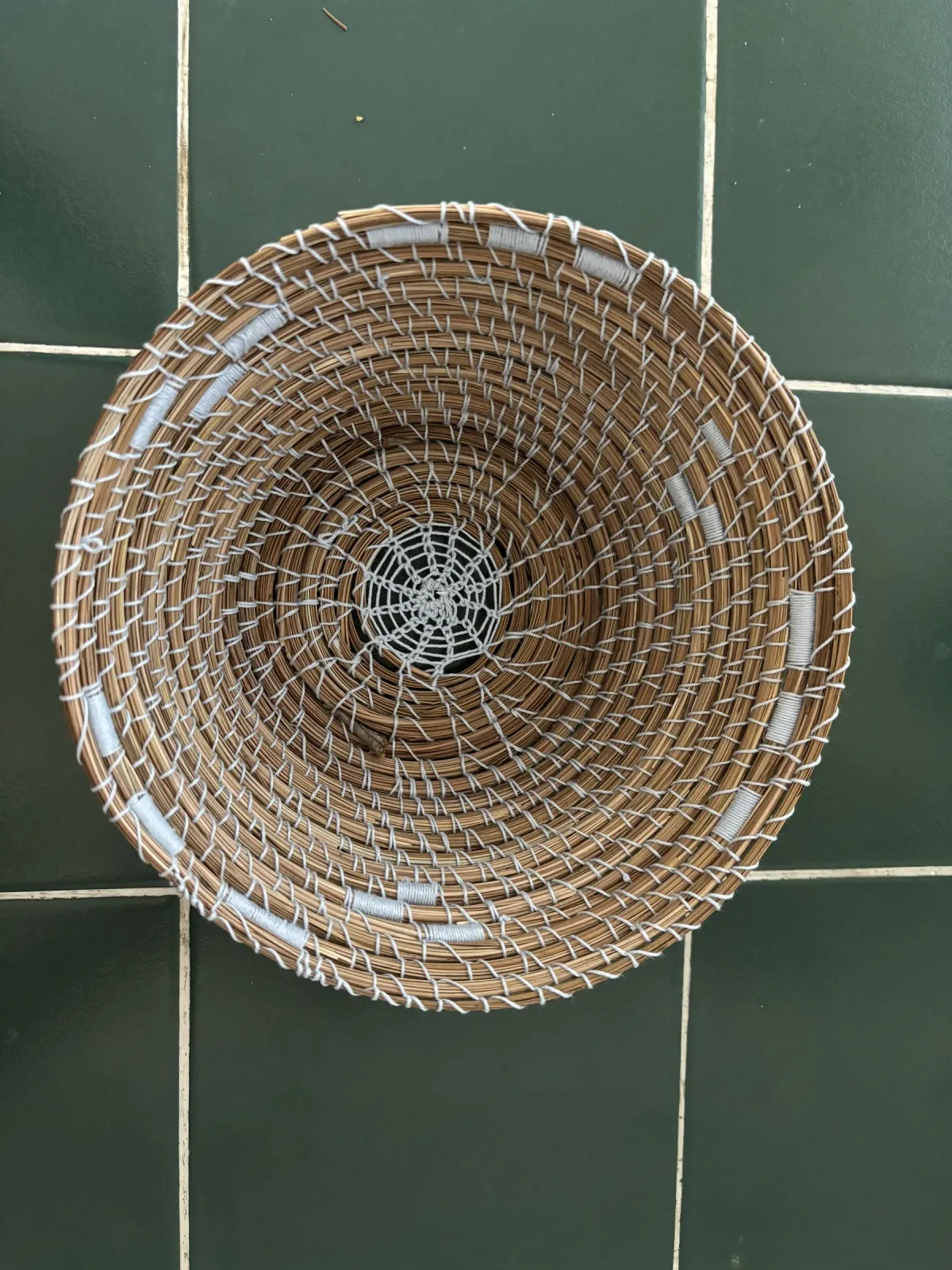 Woven basketNatural fibersHandicraftGreen tilesOverhead viewSpiral patternTextile artRealismLight / SereneStill Life / Objects