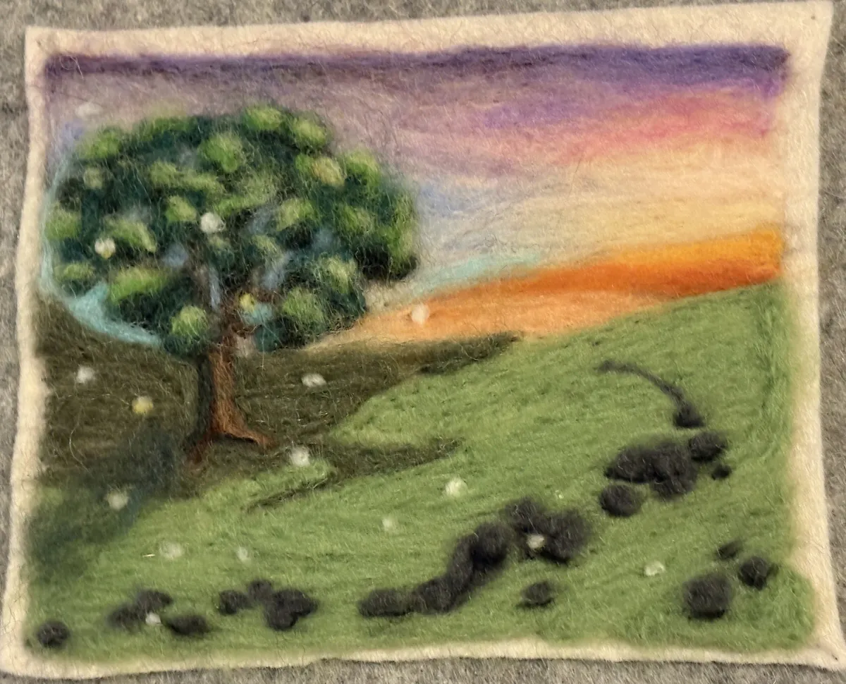 Needle feltingFelt artLandscapeSunsetTreeHillNatureRealismLight / SereneTherapeutic / ReflectiveLandscape / Nature
