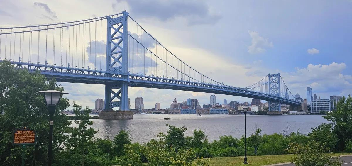 Benjamin Franklin BridgePhiladelphiacityscaperiversuspension bridgehistorical markerurban landscapeRealismStorytelling / NarrativeLight / SereneLandscape / NatureCity / ArchitectureSeascape / WaterHistorical / Cultural