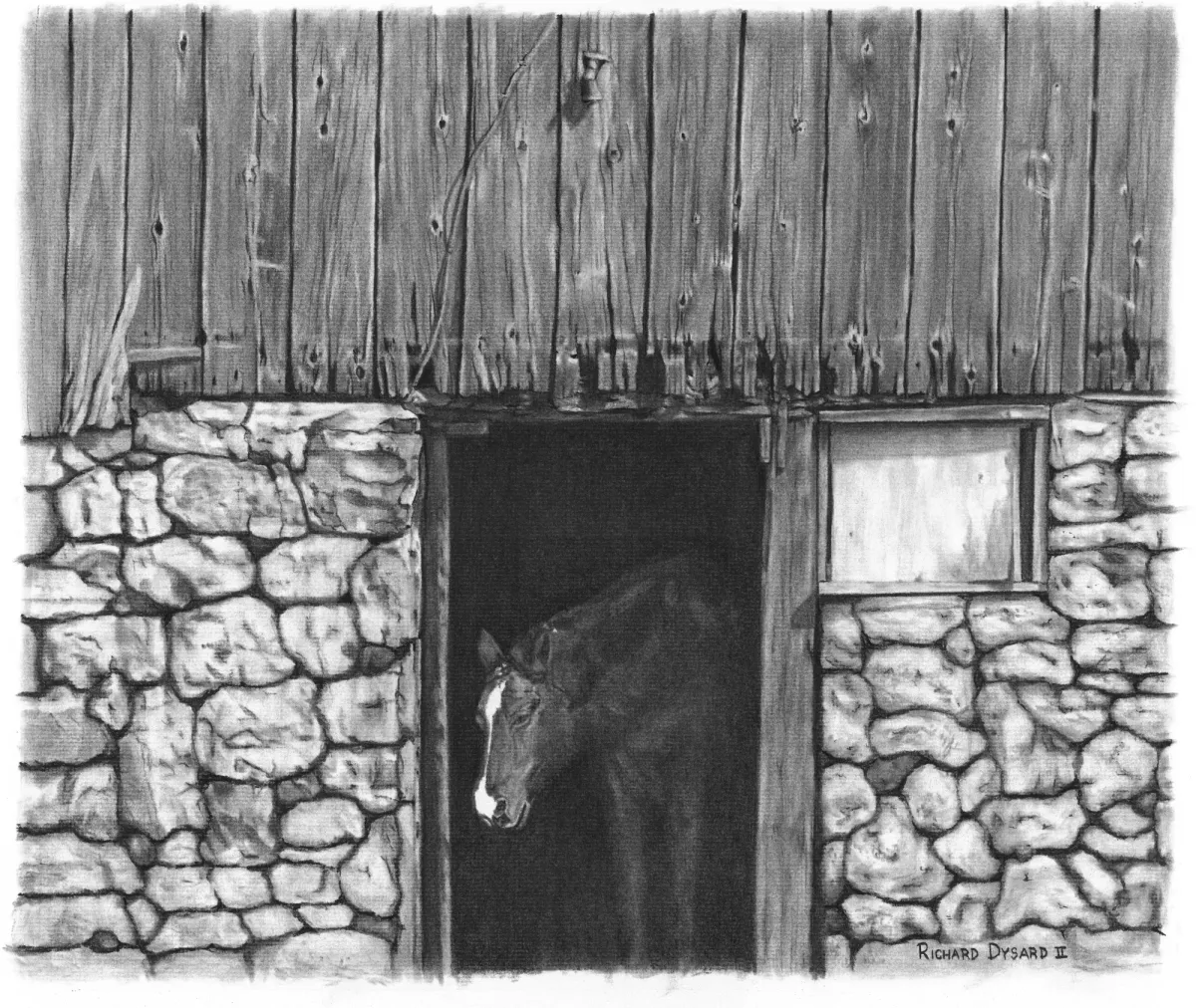 graphite drawinghorsebarnrusticanimalrealismstone wallRealismDark / DramaticStorytelling / NarrativeAnimals / WildlifeLandscape / NatureHistorical / Cultural