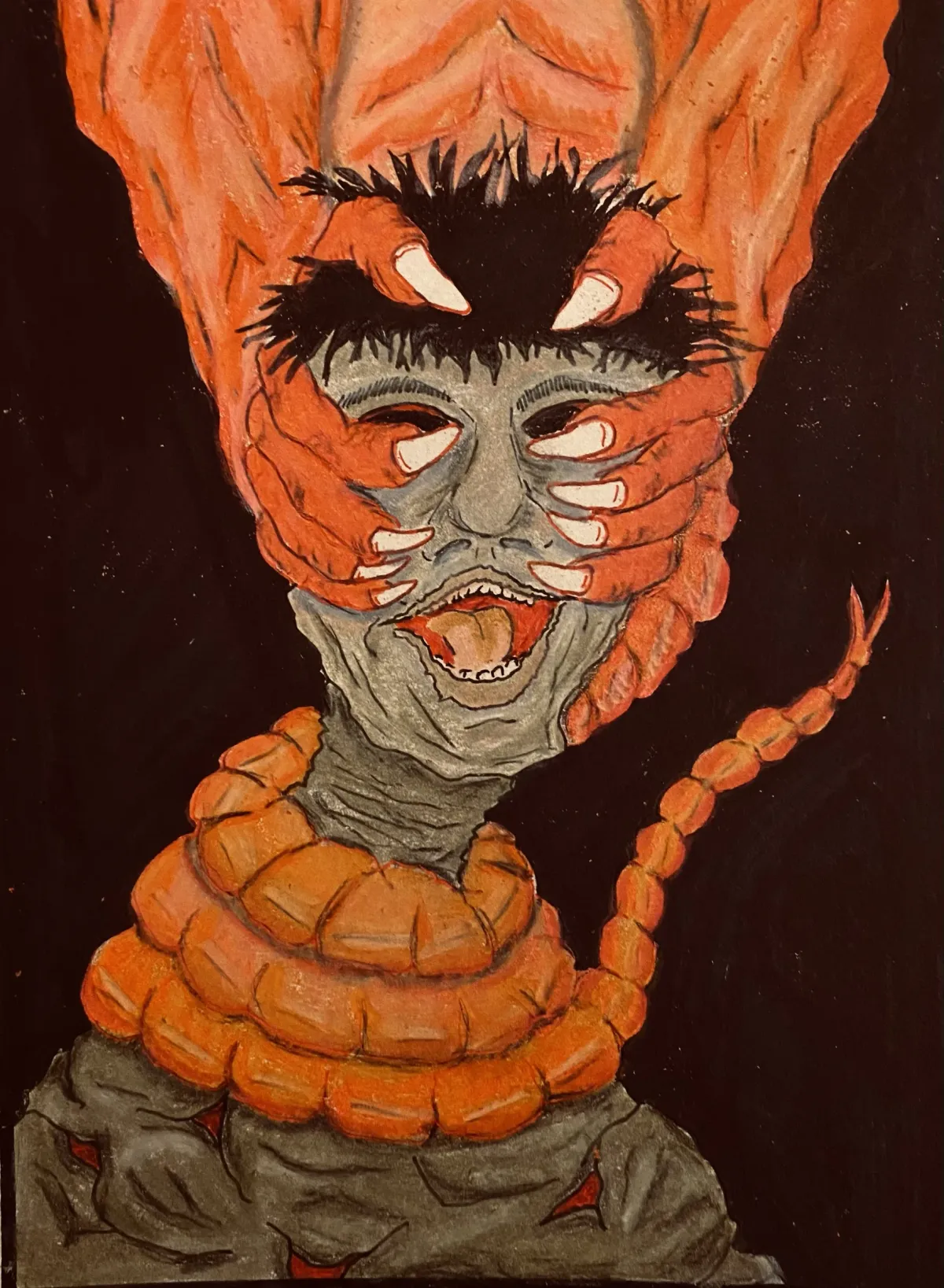 grotesquemacabresurrealhorror artmulti-limbedorange and blackexpressionisticExpressionism / EmotionalDark / DramaticStorytelling / NarrativePortrait / PeopleSurreal / ImaginativeConflict / Sacrifice