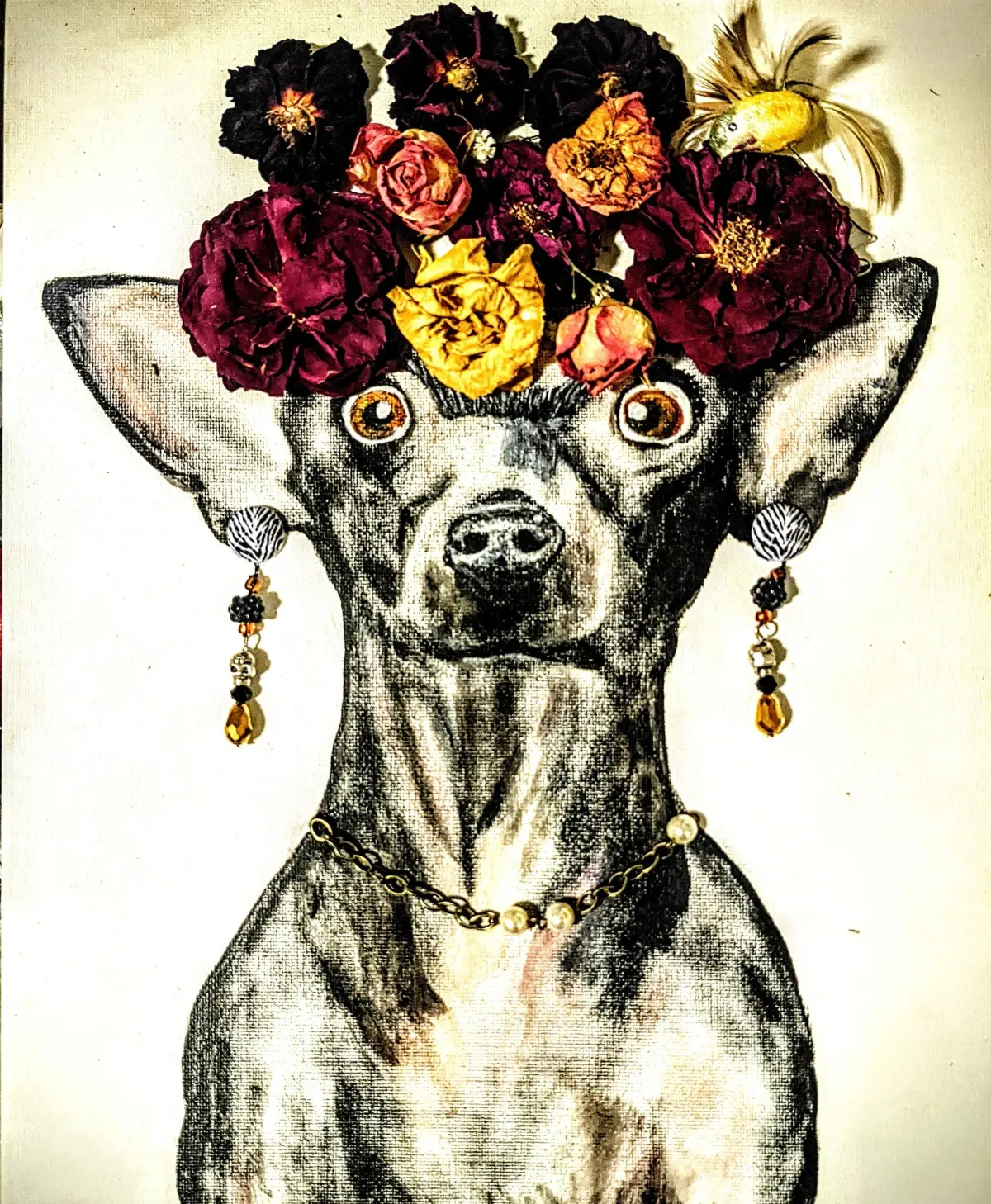 chihuahuadog portraitmixed mediafloral crownjewelrywhimsicalpet artRealismContemporary / ModernBold / GraphicStorytelling / NarrativeAnimals / WildlifePortrait / PeopleSurreal / ImaginativeHistorical / Cultural