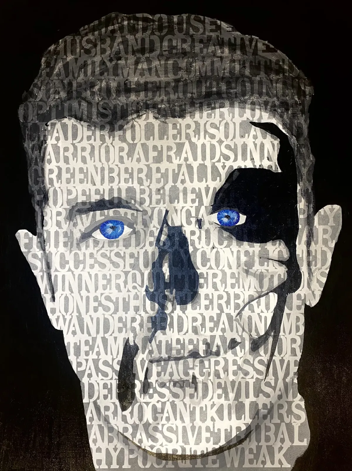 portraittypographyblack and whitemixed mediaidentitywordstext artContemporary / ModernBold / GraphicDark / DramaticStorytelling / NarrativeExpressionism / EmotionalPatriotic / Military / FreedomVeteran Story / ServicePortrait / PeopleSpiritual / SymbolicConflict / Sacrifice