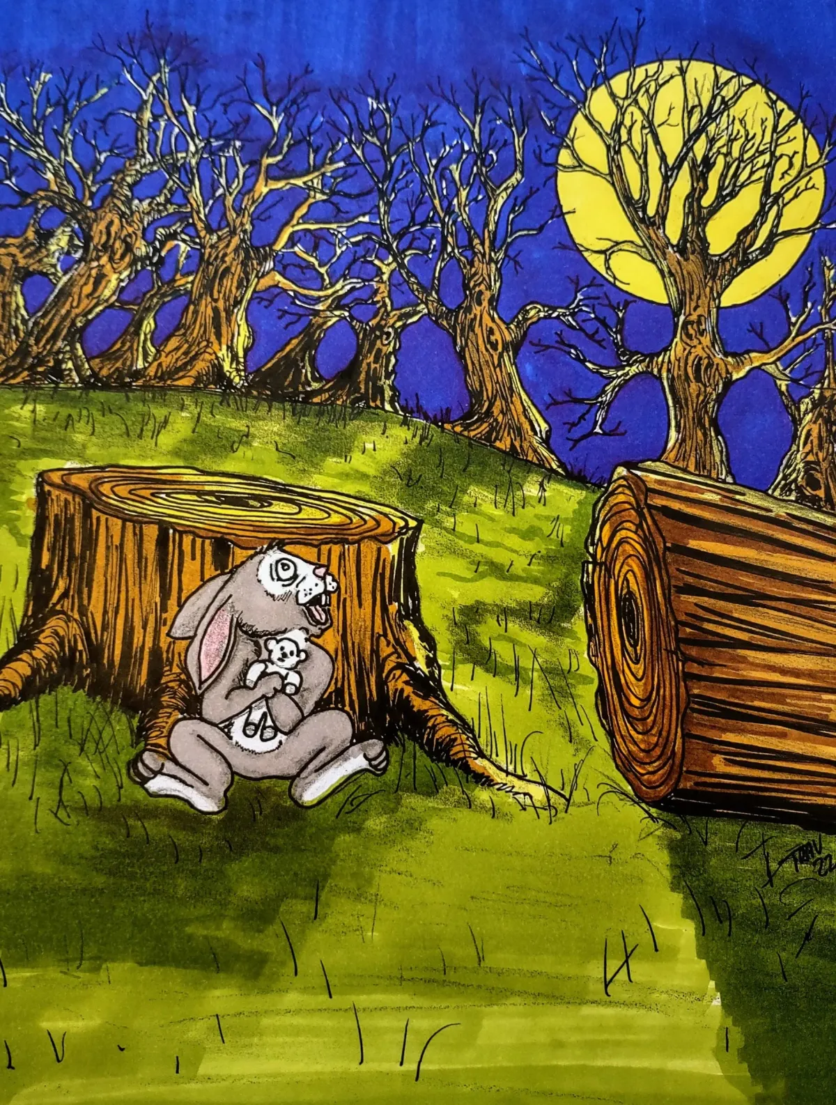 RabbitFull moonBare treesTree stumpFelled logNight sceneDistressStorytelling / NarrativeExpressionism / EmotionalDark / DramaticBold / GraphicLandscape / NatureAnimals / WildlifeConflict / Sacrifice