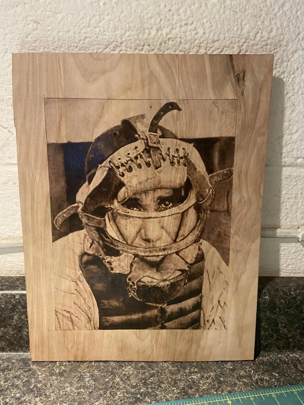 pyrographywood burningbaseballcatcherportraitvintage sportsbaseball maskRealismStorytelling / NarrativeDark / DramaticPortrait / PeopleHistorical / Cultural