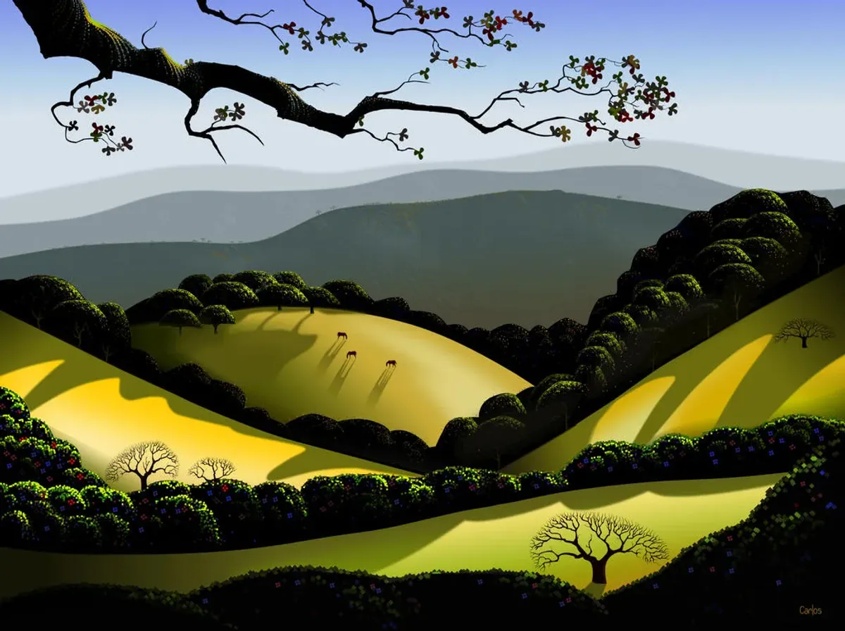 stylized landscaperolling hillshorsesdark treeslong shadowsserene naturedigital artRealismContemporary / ModernBold / GraphicDark / DramaticStorytelling / NarrativeLandscape / NatureAnimals / WildlifeSurreal / Imaginative