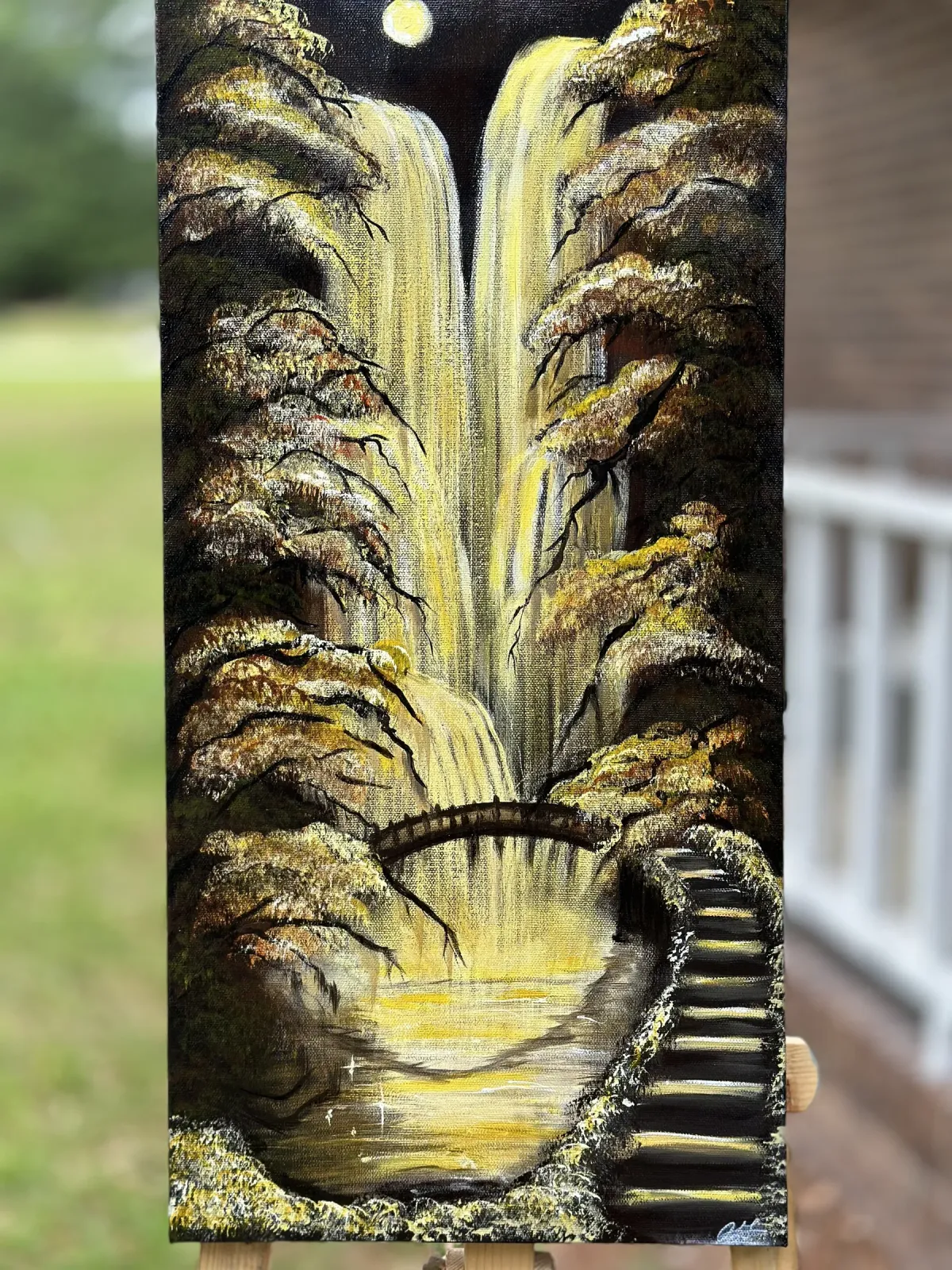waterfallmoonlitfantasy landscapeglowing waterarched bridgestairsnocturneExpressionism / EmotionalDark / DramaticStorytelling / NarrativeLandscape / NatureSeascape / WaterSpiritual / SymbolicSurreal / Imaginative