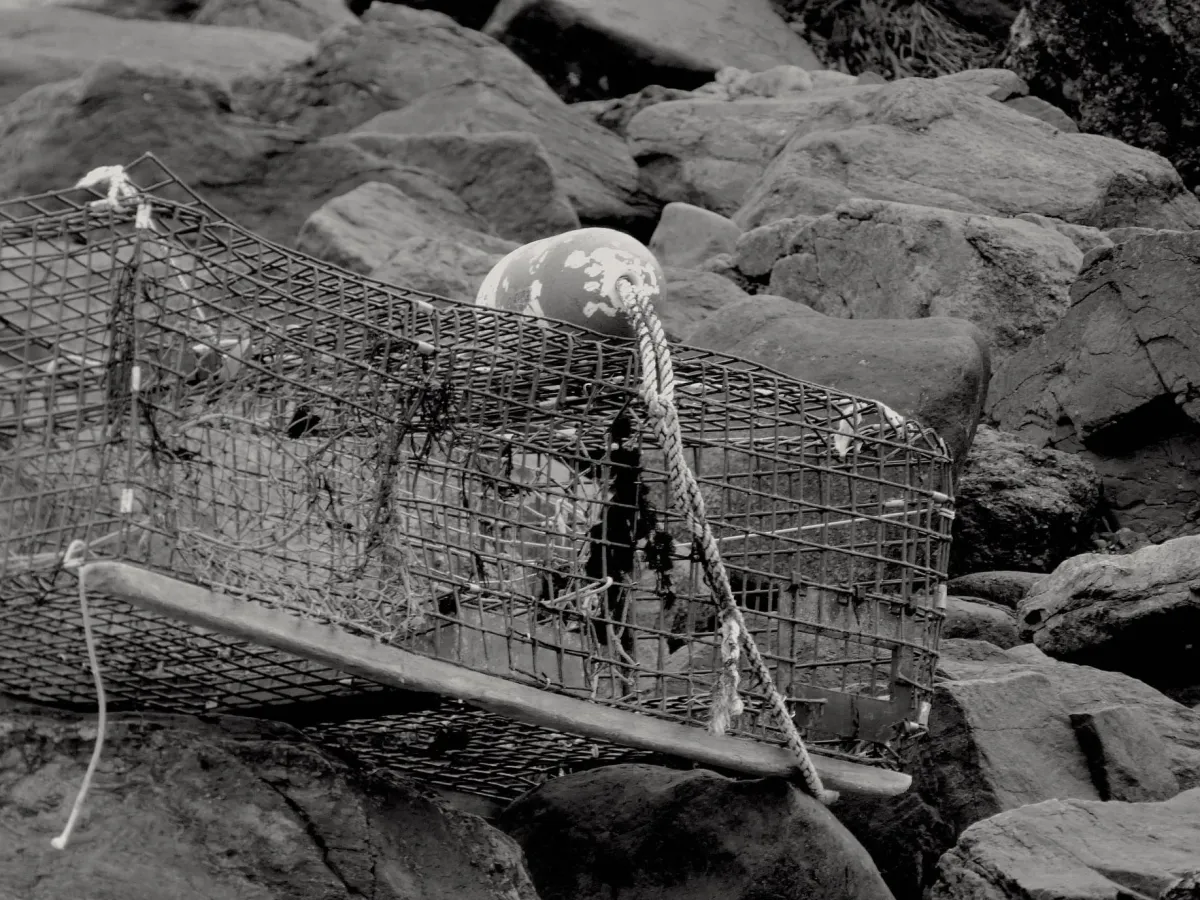 Lobster trapbuoyroperockscoastlineblack and whitefishing gearRealismDark / DramaticStorytelling / NarrativeLandscape / NatureSeascape / WaterStill Life / ObjectsHistorical / Cultural