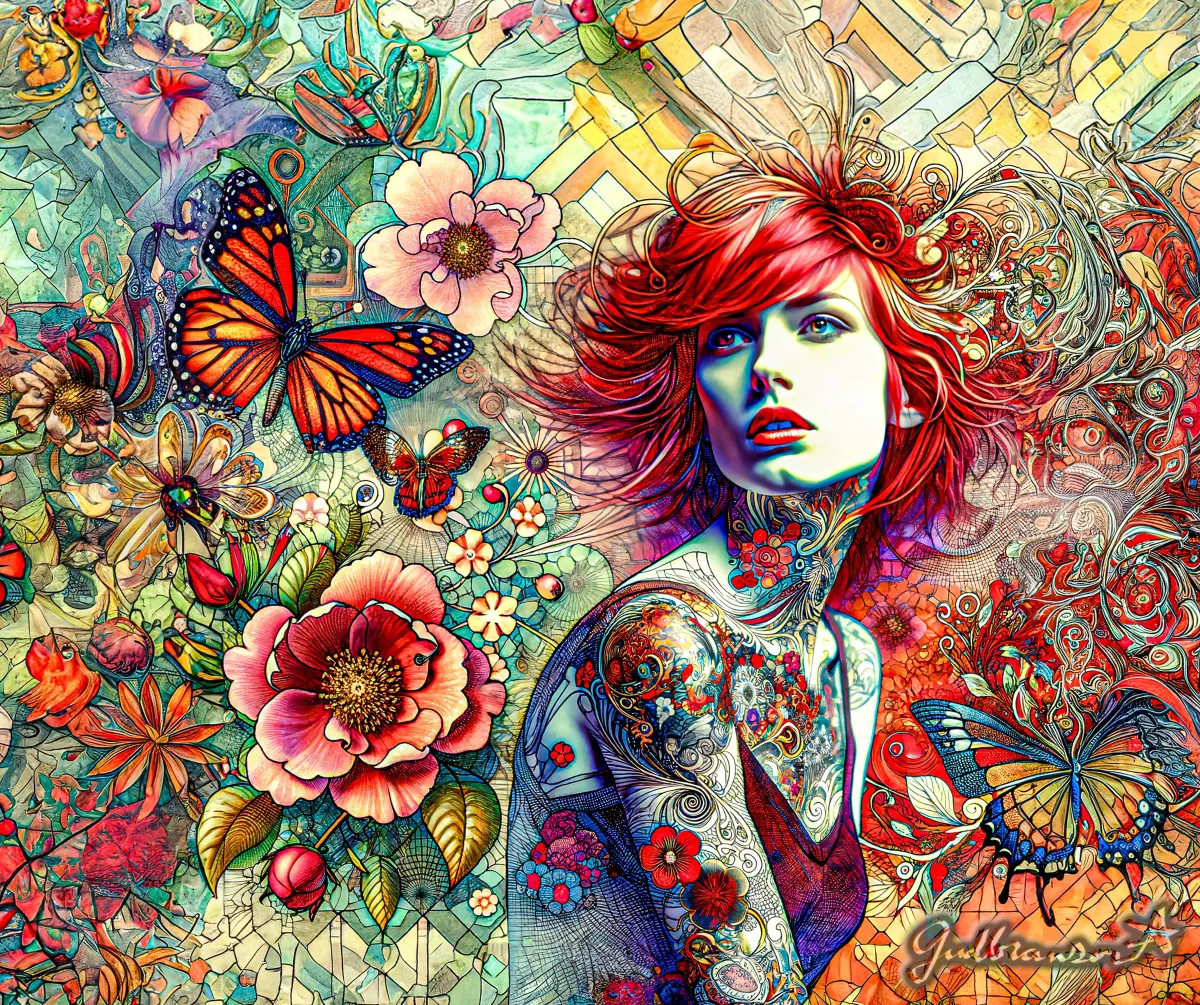 womanred hairtattoosbutterfliesflowersmosaicvibrantcolorfulportraitnatureContemporary / ModernBold / GraphicStorytelling / NarrativeExpressionism / EmotionalInspirational / UpliftingPortrait / PeopleLandscape / NatureSpiritual / Symbolic