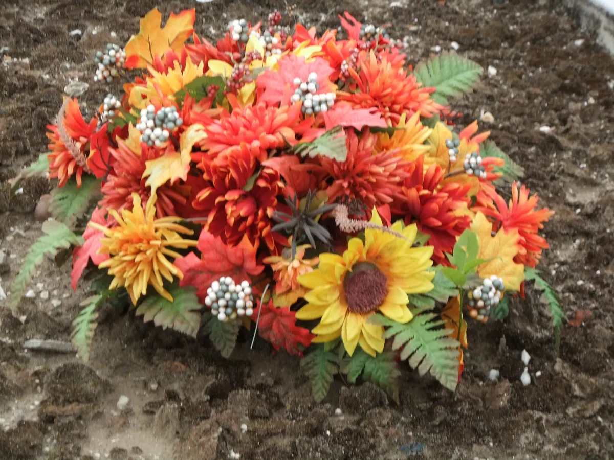 artificial flowersautumnfall foliagechrysanthemumsunflowerberriesmemorialRealismLight / SereneLandscape / NatureStill Life / ObjectsSpiritual / Symbolic