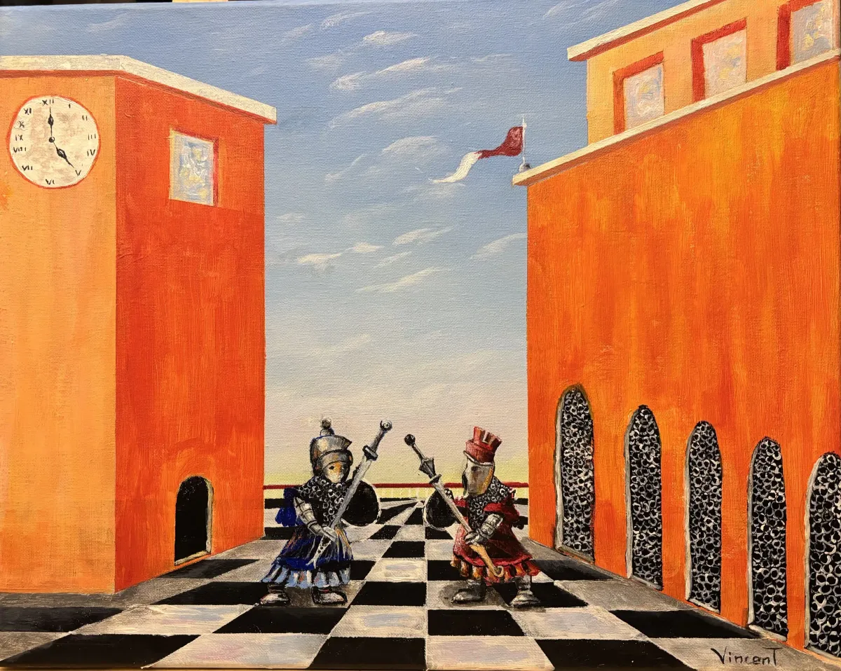 SurrealismChess piecesMedieval warriorsOrange buildingsCheckerboardBlue skyEnigmaticContemporary / ModernBold / GraphicStorytelling / NarrativeAbstractSurreal / ImaginativeHistorical / CulturalAbstract / Conceptual